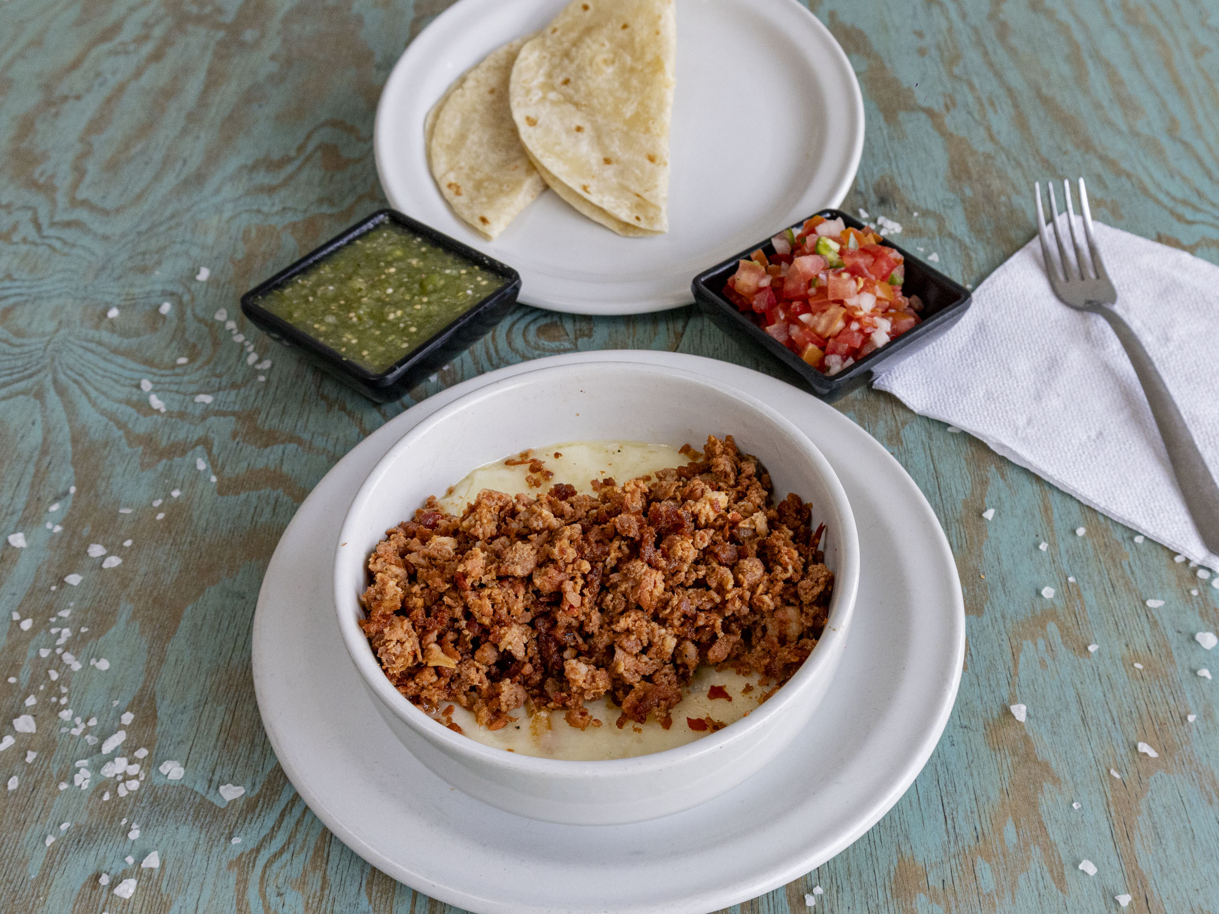 Queso amarillo, panela y manchego. Bañado con salsa Bechamel y gratinado, acompañado con chilaquiles rojos, verdes, morita, pasilla o guajillo.