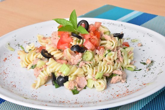 Fusilli con aceituna negra, jitomate, apio, espinaca y atún con aceite de albahaca.