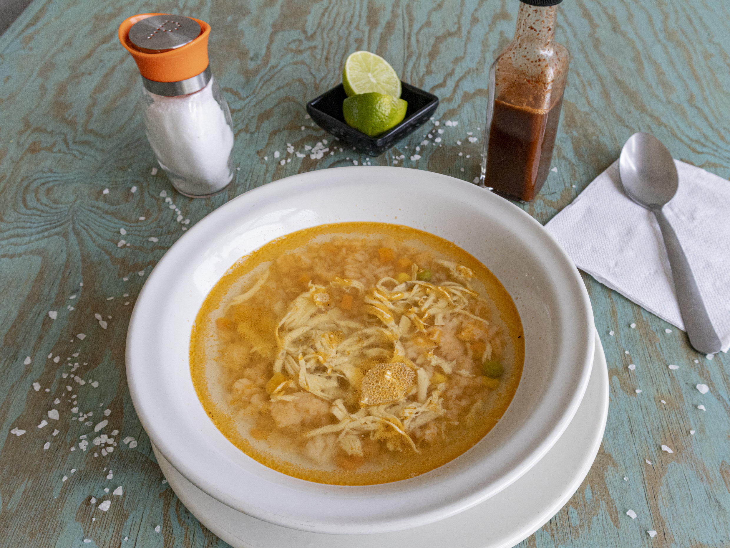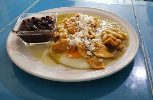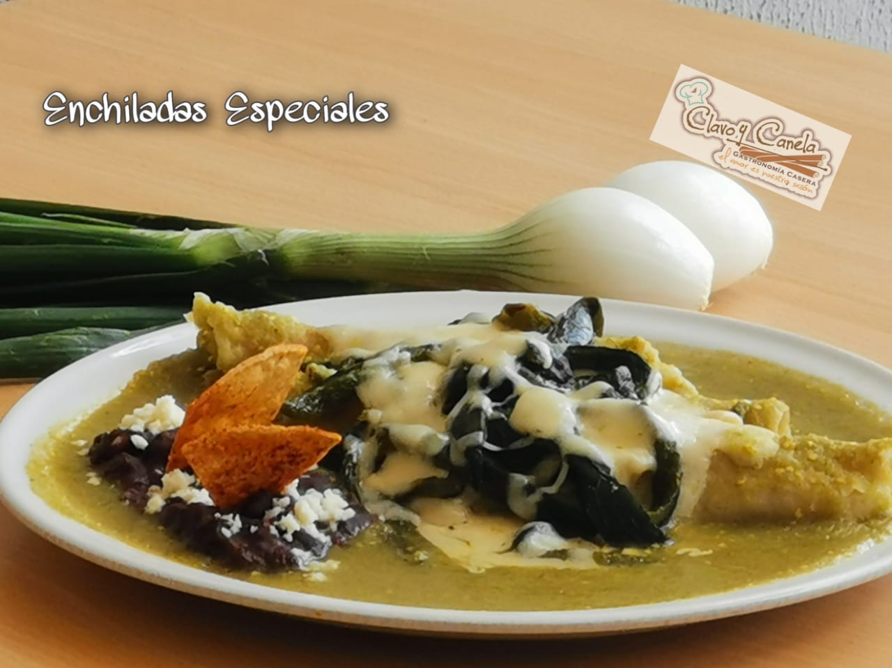De pollo o queso, bañadas en salsa cremosa verde y gratinados, acompañadas de frijoles refritos.