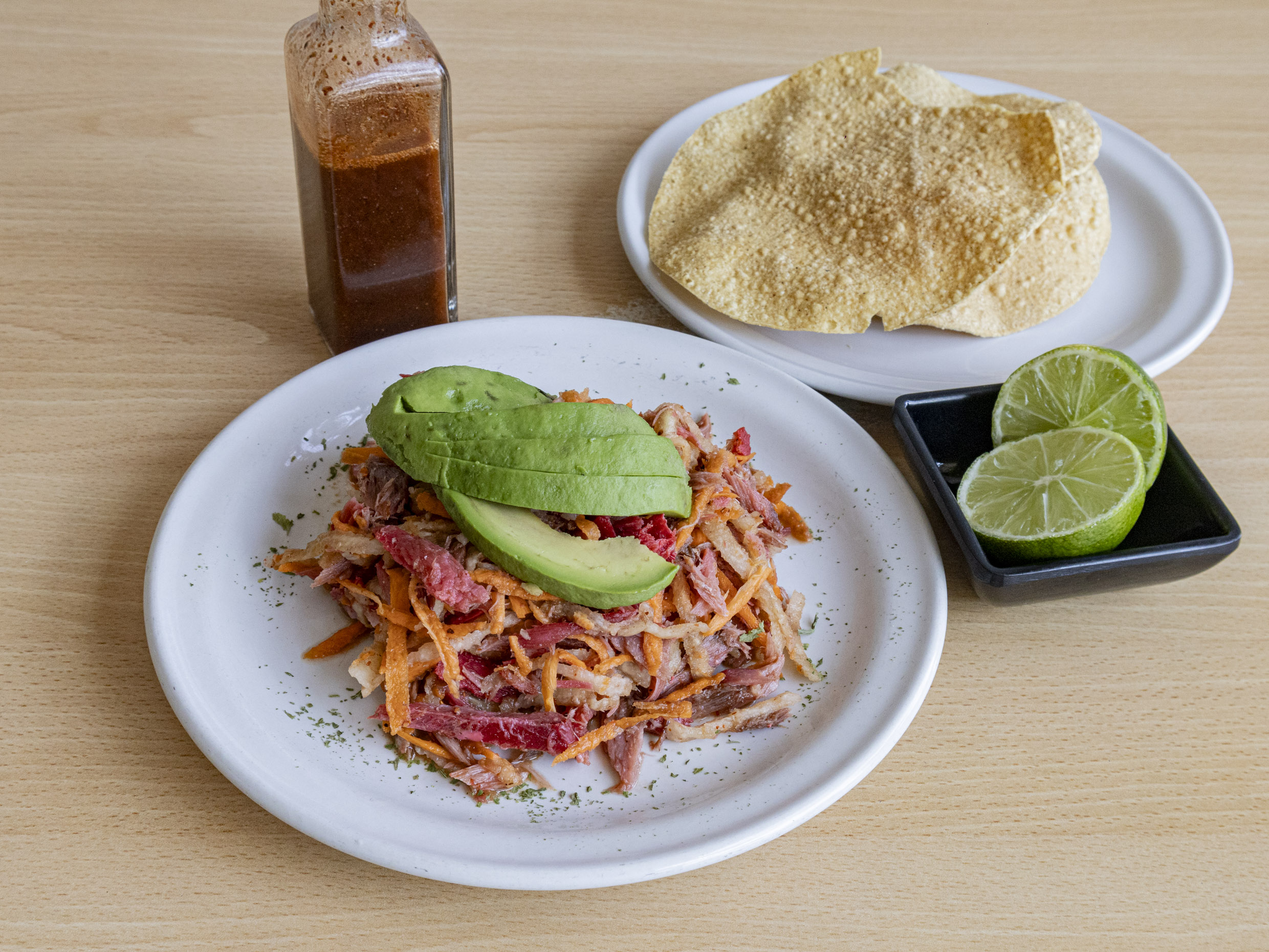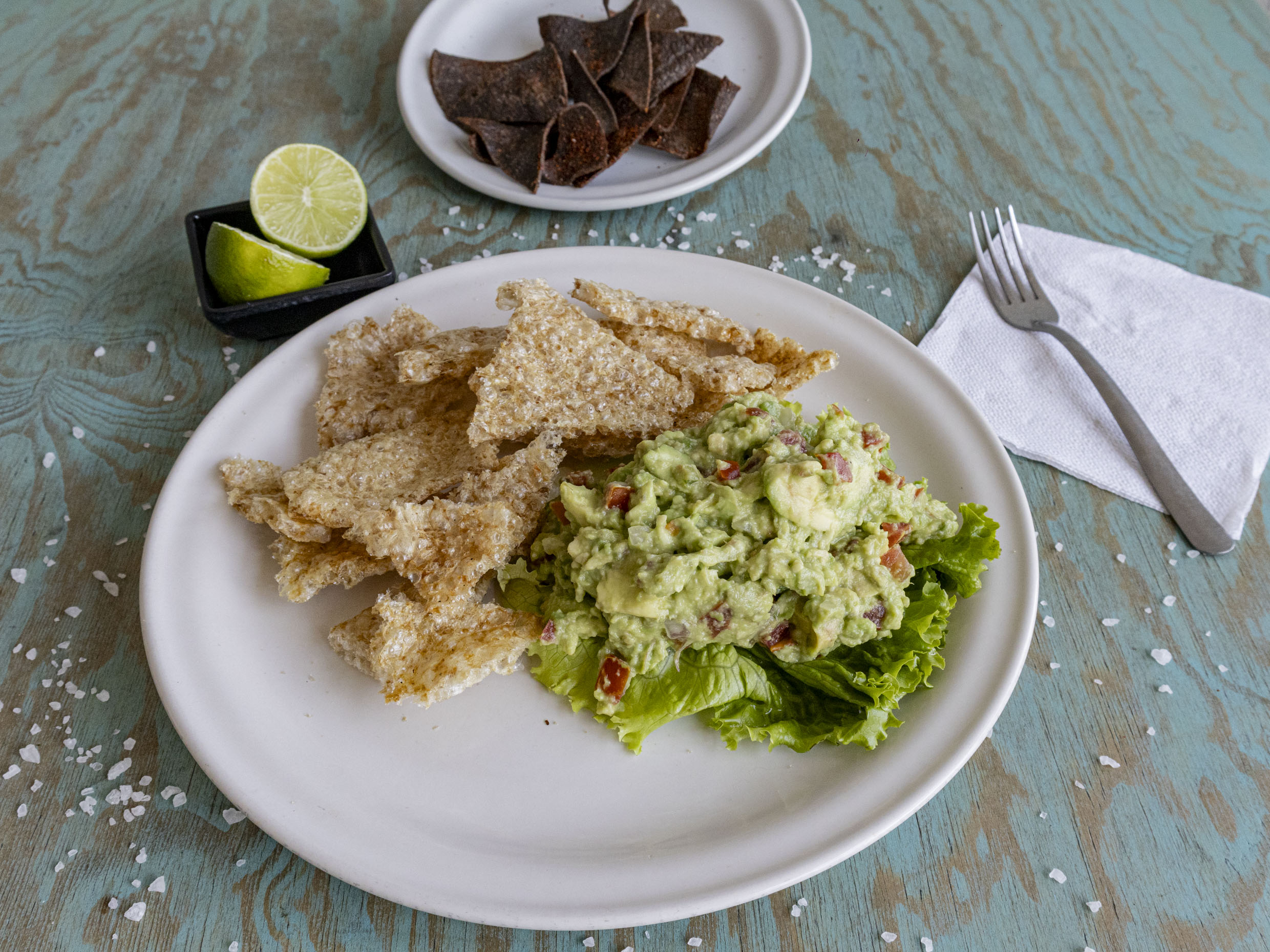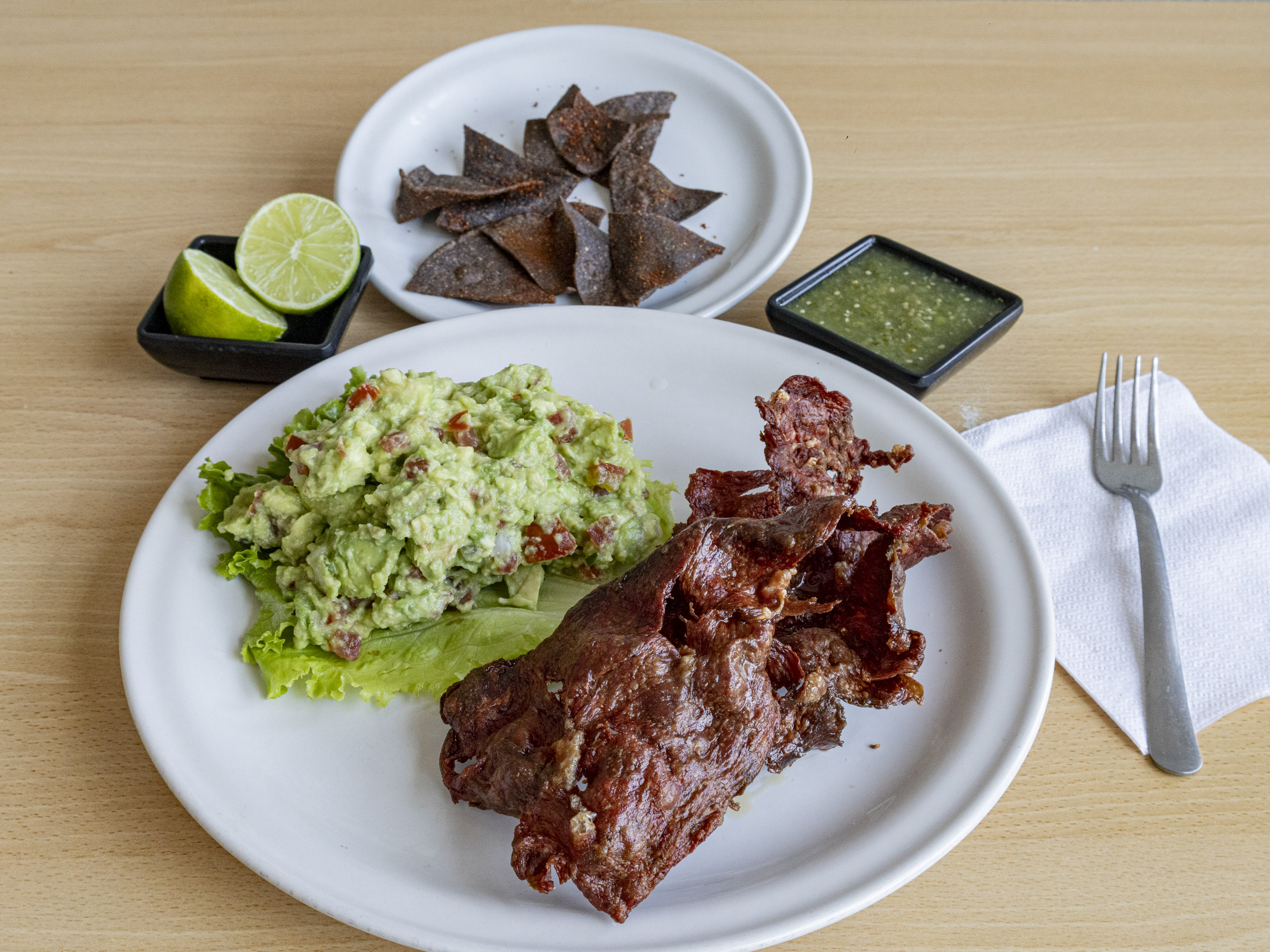 con guarnicion de chila pasilla, queso panela, aguacate y chicharron