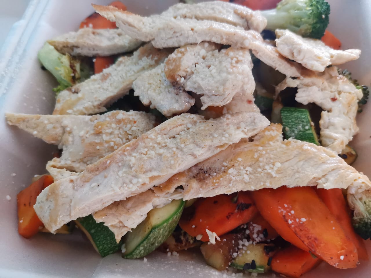 Calabaza, berenjena, brócoli y zanahoria asadas con tiritas de pechuga de pollo a la parrilla y aderezo de soya y jengibre.