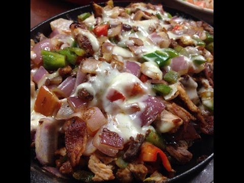 Fajitas de res, frijoles refritos, guacamole, tocino y chiles toreados.