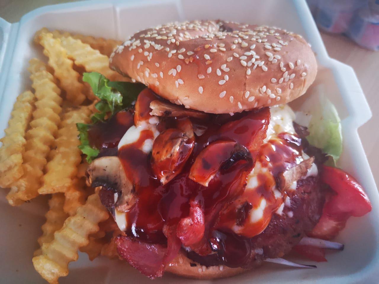 Carne de res, champiñones preparados, tocino, salsa especial y queso asadero, con papas a la francesa o ensalada.