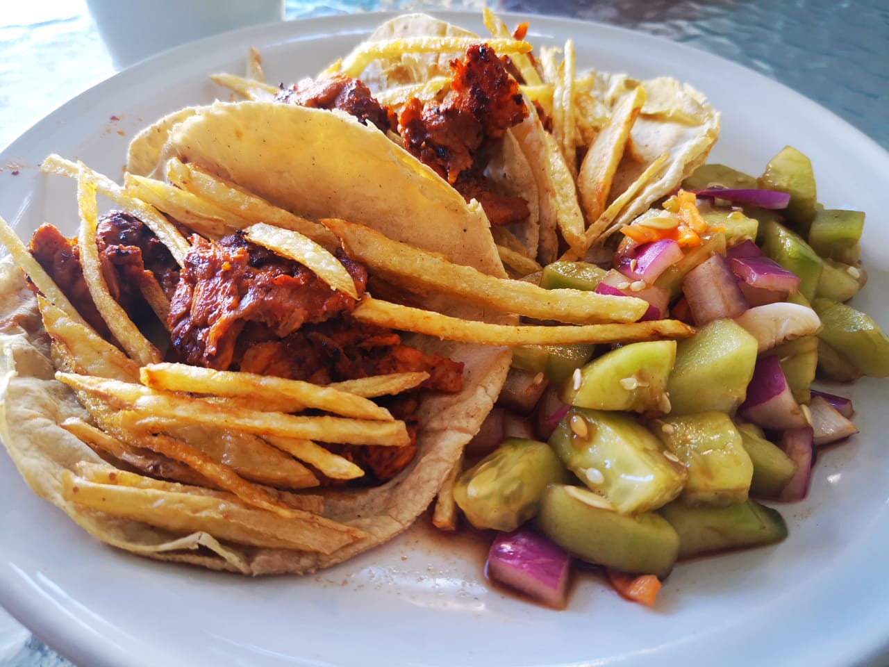 Papas con chorizo, frijoles, lechuga, crema, queso y aguacate.