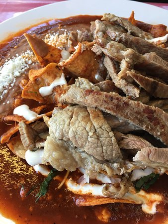 En salsa de chipotle con chorizo y gratinados, acompañados de frijoles refritos.