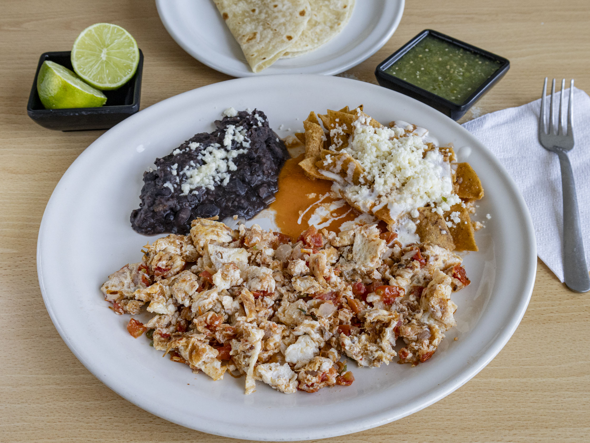 Los tradicionales huevos revueltos con chile, cebolla y jitomate, con guarnición de frijoles refritos y chilaquiles rojos, verdes, morita, pasilla o guajillo.
