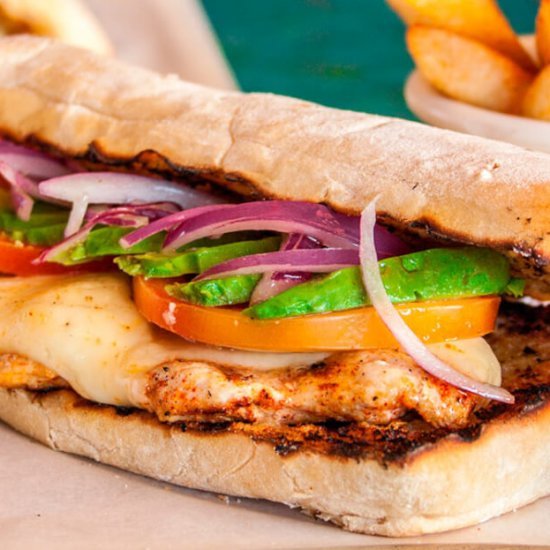 Medallón de pollo empanizado con salsa BBQ, con lechuga, jitomate, tocino, queso y aguacate, con papas a la francesa o ensalada.