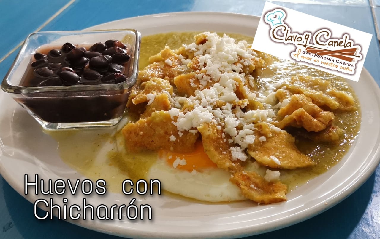 Estrellados, bañados con chicharrón en salsa y cuadritos de queso de rancho acompañado de frijoles de la olla.