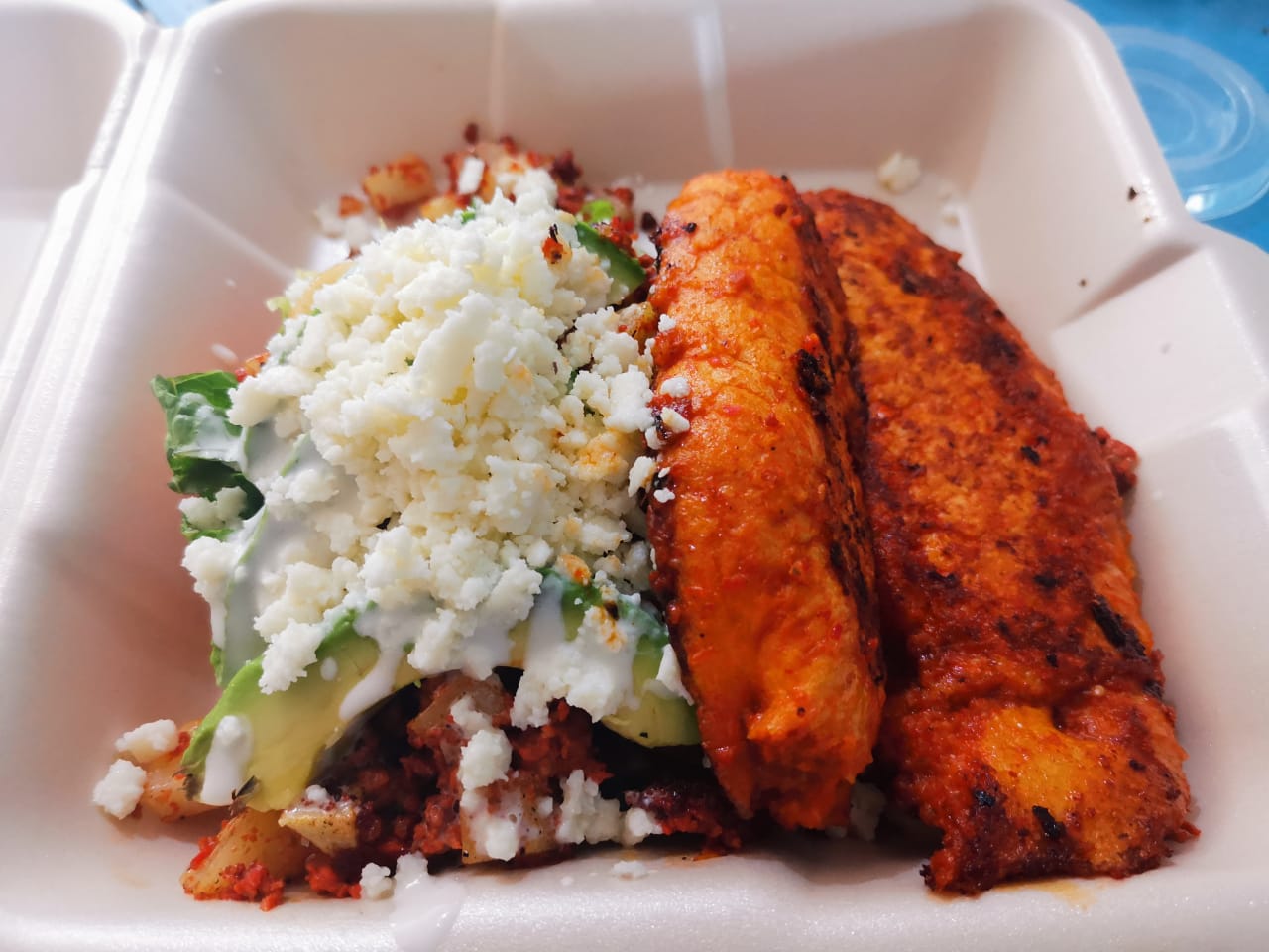 Bañadas con la salsa del día. Acompañada de frijoles de la olla y tortillas.