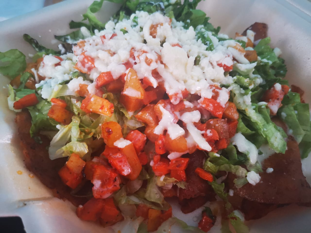 Rellenas de pollo con lechuga fileteada, queso y crema acompañada de frijoles refritos, acompañadas de frijoles refritos.