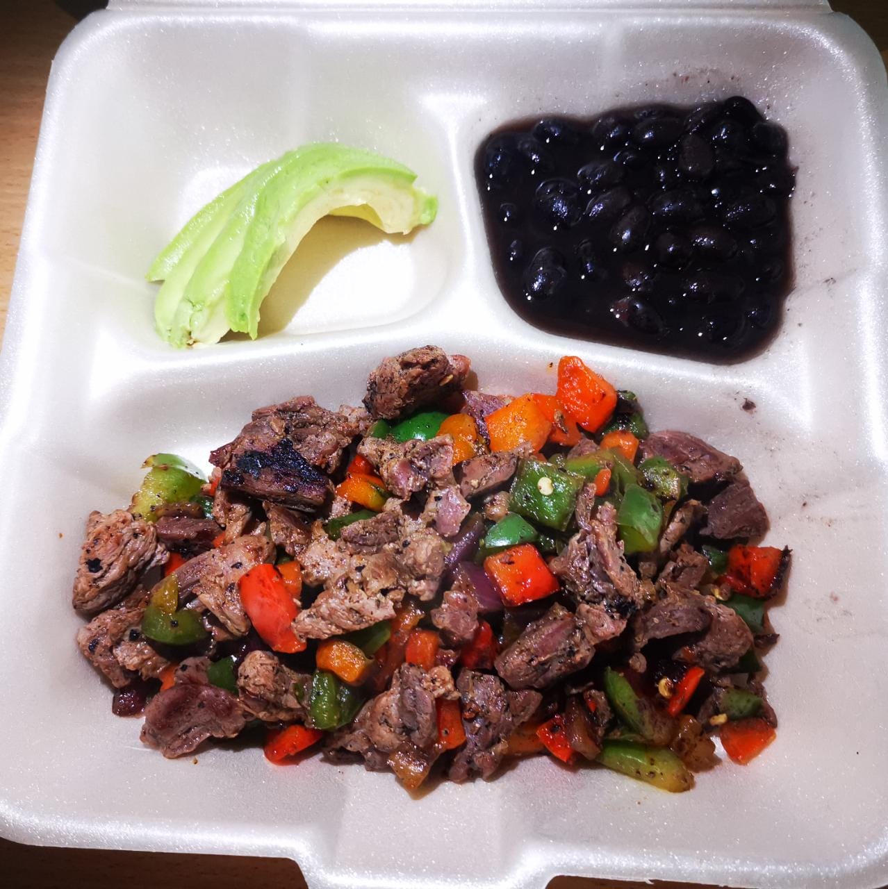 Arrachera en fajitas, con pimientos y cebolla. Acompañado de frijoles de la olla y aguacate.