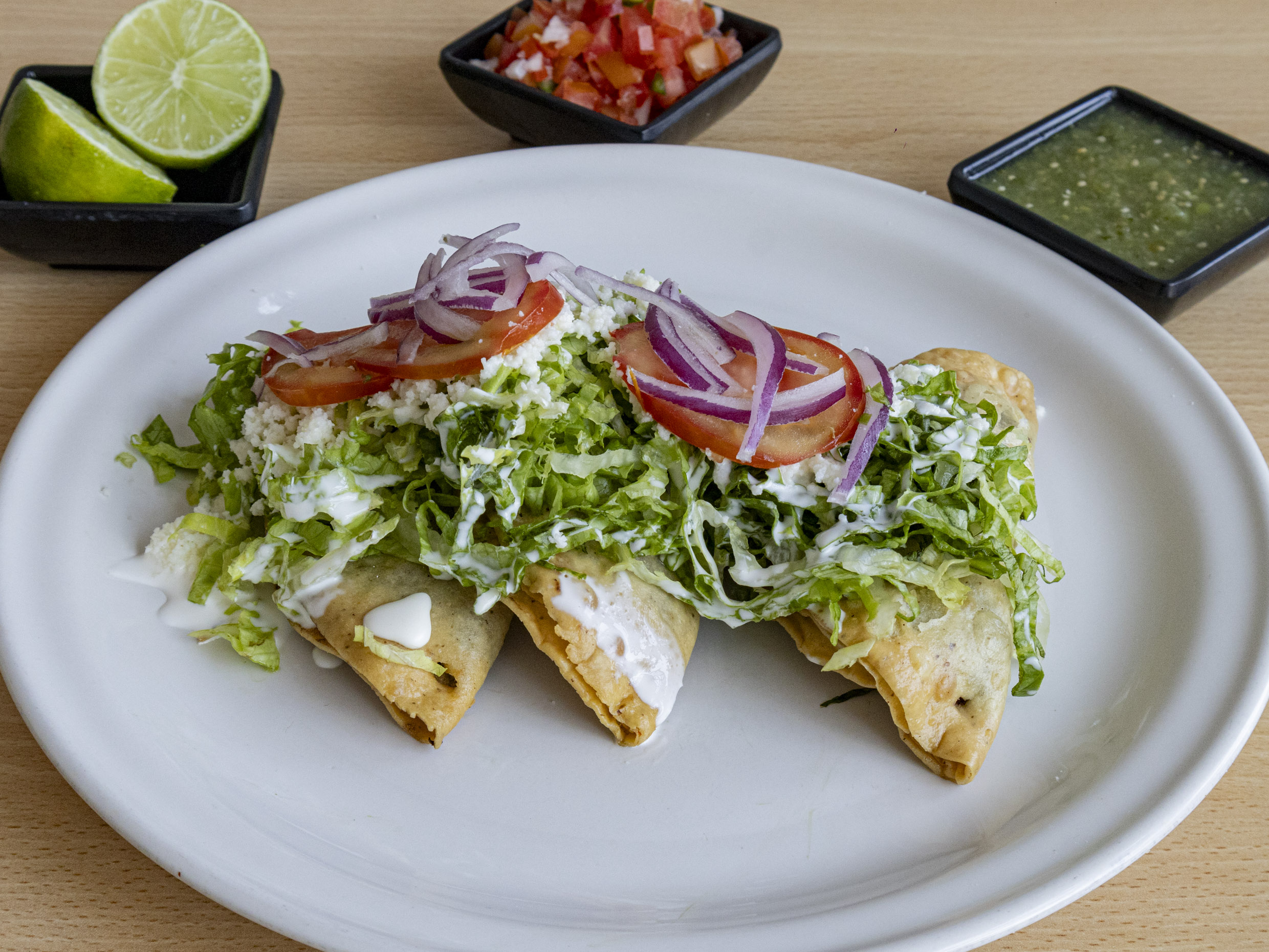 Acompañados de frijoles refritos. Salsa a escoger: verde, roja, morita, guajillo o divorciados.