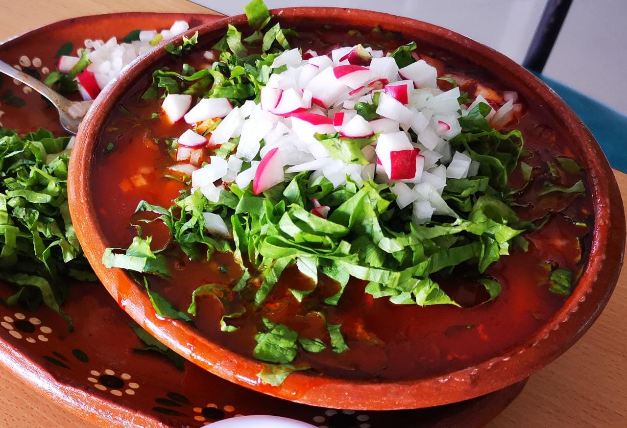 Rellenas de verduras, bañadas en salsa roja con un toque de epazote, y lechuga fileteada y rodajas de rabano