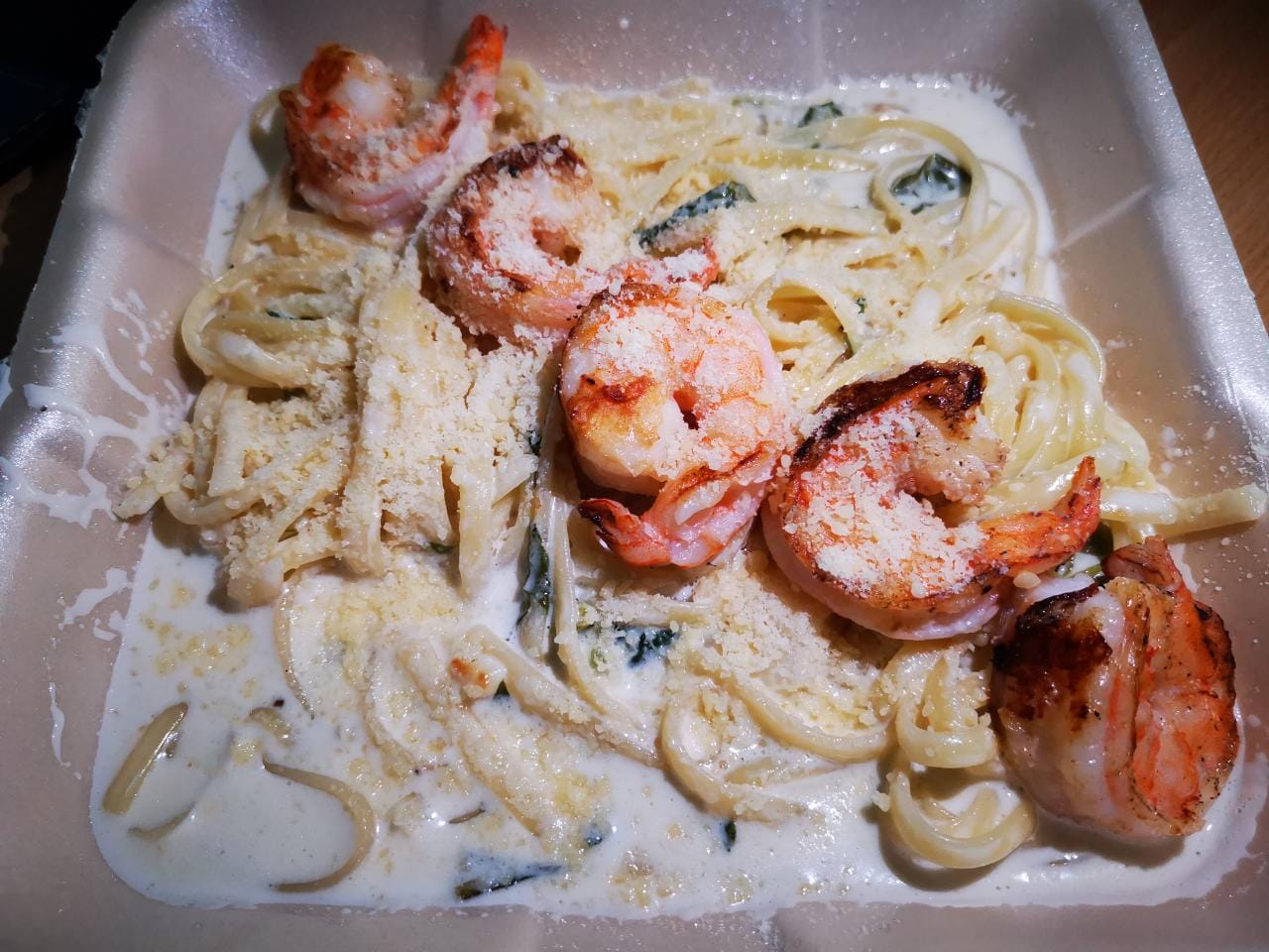 Camarón con pimientos, cebolla morada gratinada. Acompañada de arroz y ensalada.