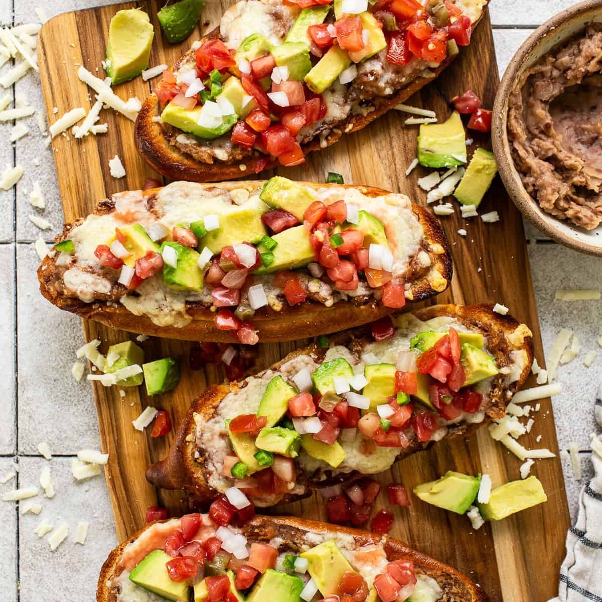 frijoles, queso asadero , crema, queso y aguacate