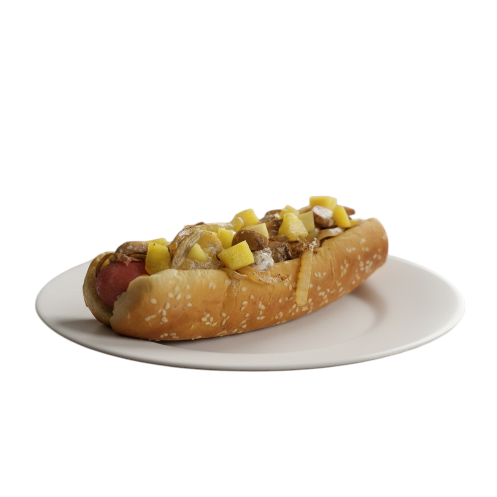 Pan Jumbo salchicha jamón piña asada queso asadero cebolla asada chile mayonesa mostaza y catsup.