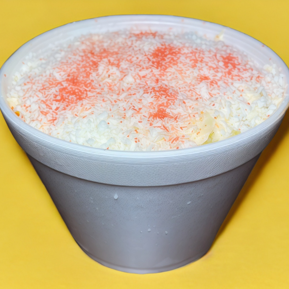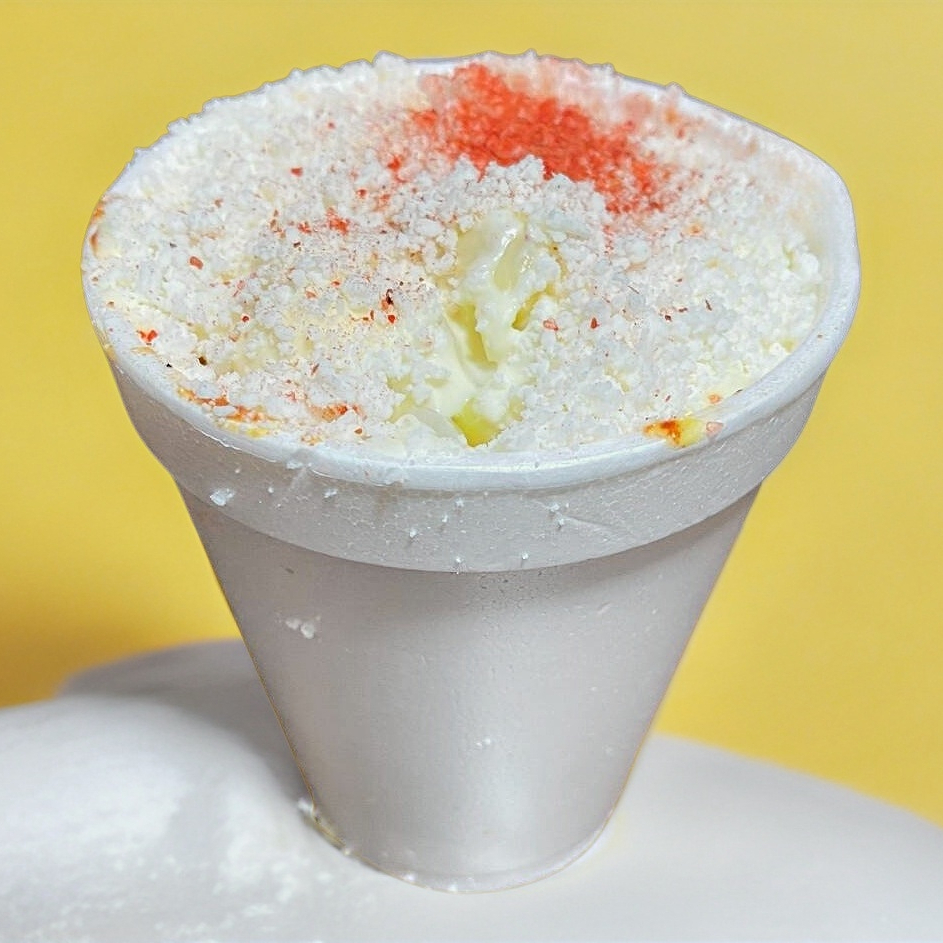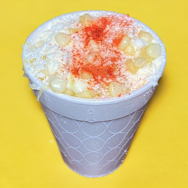 Medio litro de elote blanco o amarillo, con crema, mayonesa, queso amarillo, queso molido y dos capas de espolvoreado