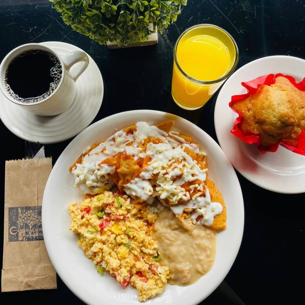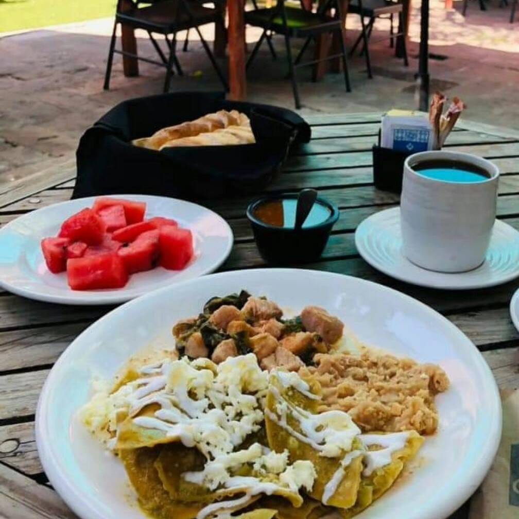 Carne de puerco al serrano, chilaquiles rojos o verdes y frijoles refritos.