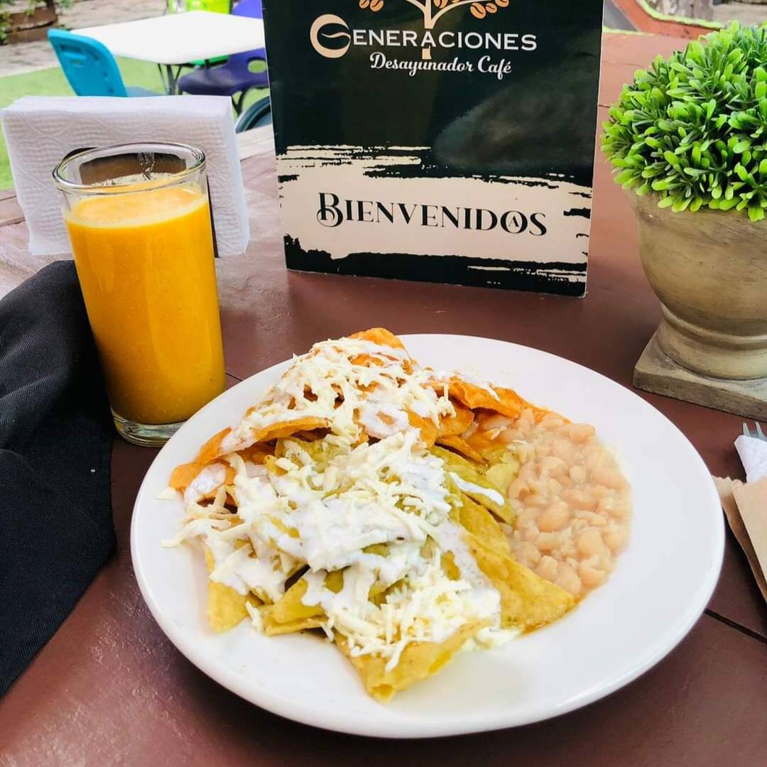 Chilaquiles verdes o rojos con cecina arrachera acompañados de frijoles refritos queso y crema