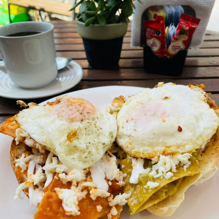 Chilaquiles rojos o verdes con queso y crema, frijoles refritos y huevo