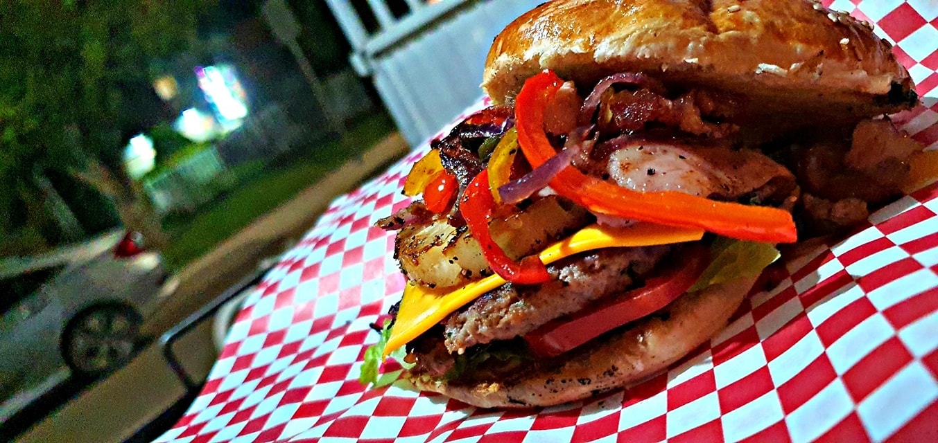 BOLLO CASERO, DOS MEDALLONES DE CARNE DE 125 GRS C/U, QUESO ASADERO EN LA BASE, LECHUGA, JITOMATE, PEPINILLOS, CHILE JALAPEÑO , QUESO TIPO AMERICANO, CEBOLLITA CARAMELIZADA, REBANADA DE JAMON Y PIÑA ASADA.