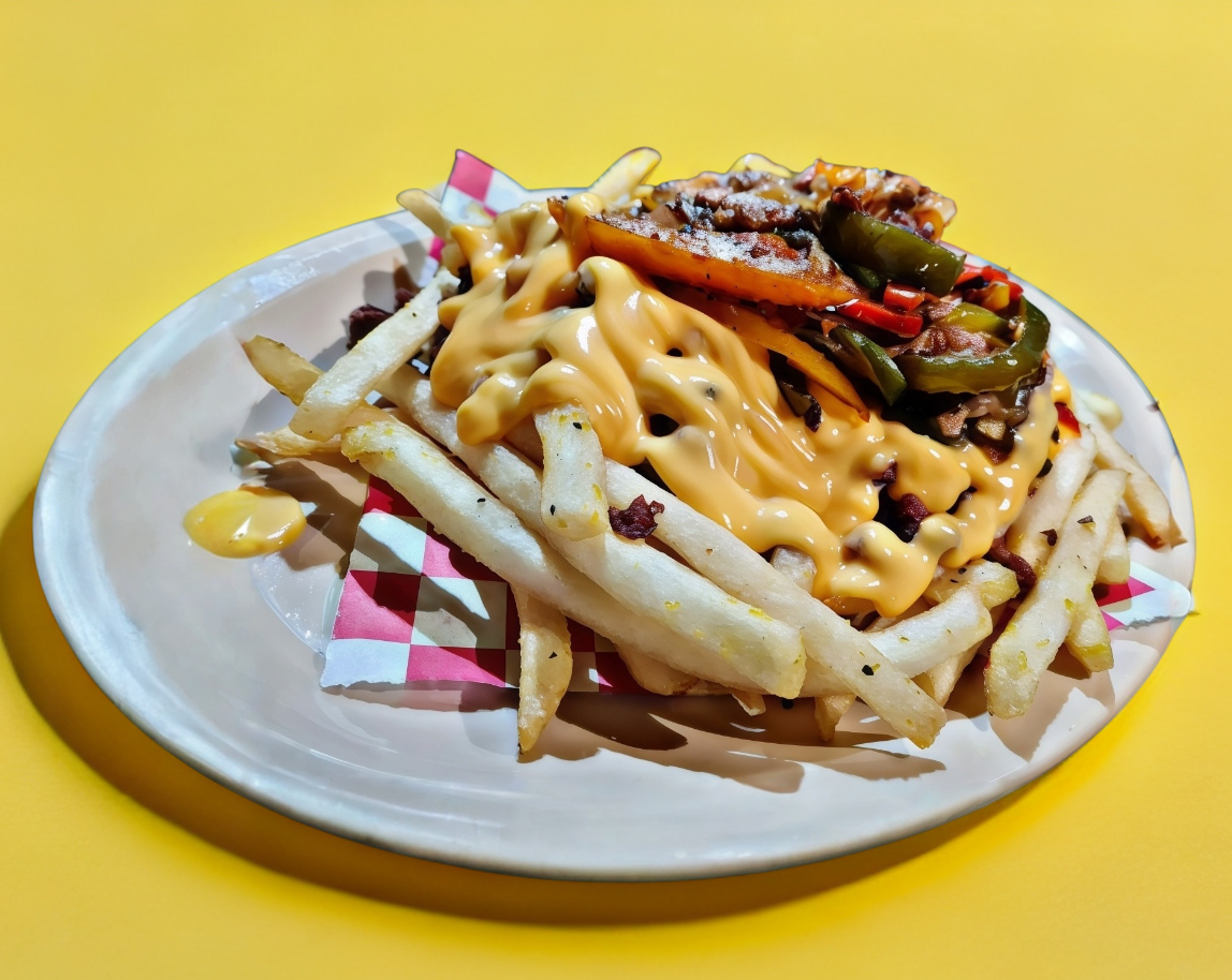 250 GRS DE PAPA A LA FRANCESA CON QUESO DE NACHOS Y 150 GRS DE TOPPING.