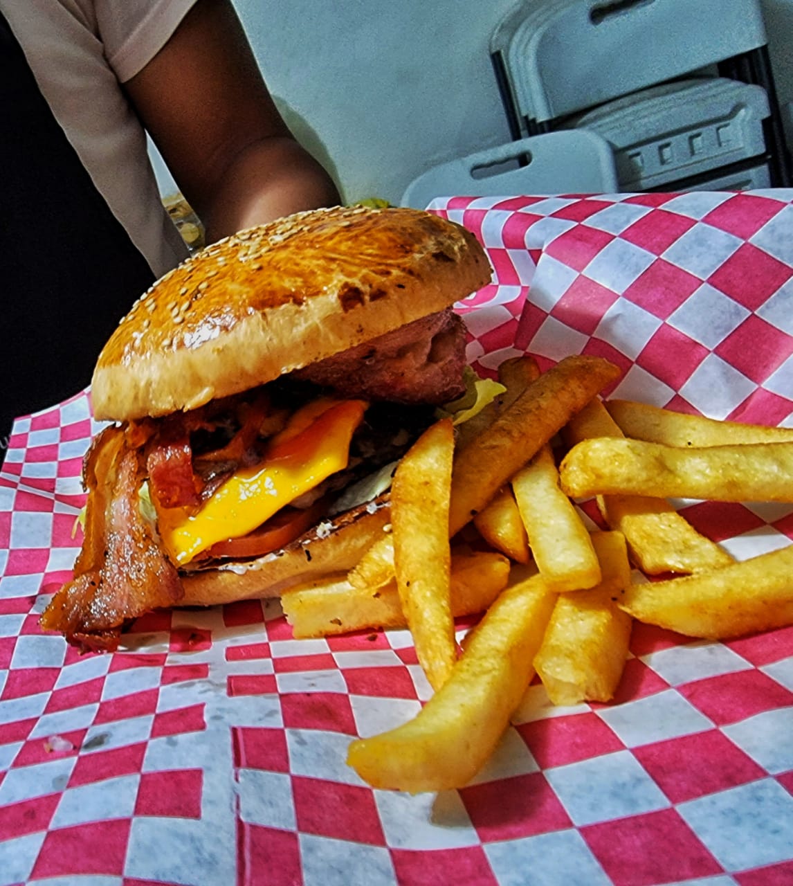 BOLLO CASERO, MEDALLON DE CARNE DE 125 GRS C/U, QUESO ASADERO EN LA BASE, LECHUGA, JITOMATE, PEPINILLOS, CHILE JALAPEÑO , QUESO TIPO AMERICANO, CEBOLLITA CARAMELIZADA, REBANADA DE JAMON Y PIÑA ASADA. ACOMPAÑADA CON 100 GRS DE PAPA A LA FRANCESA