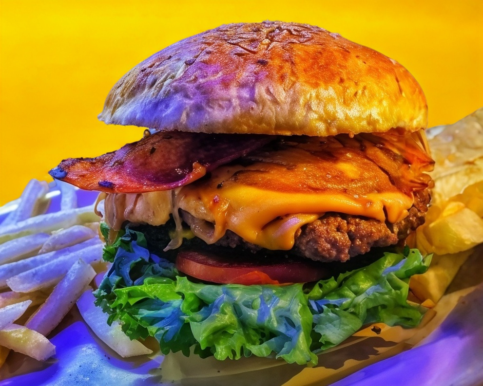 BOLLO CASERO, MEDALLON DE CARNE DE 125 GRS C/U, QUESO ASADERO EN LA BASE, LECHUGA, JITOMATE, PEPINILLOS, CHILE JALAPEÑO , QUESO TIPO AMERICANO, CEBOLLITA CARAMELIZADA, DOS TIRAS DE TOCINO CRUJIENTE ACOMPAÑADA CON 100 GRS DE PAPA A LA FRANCESA