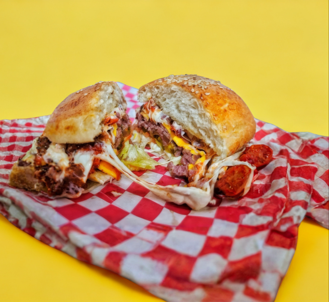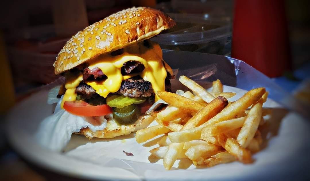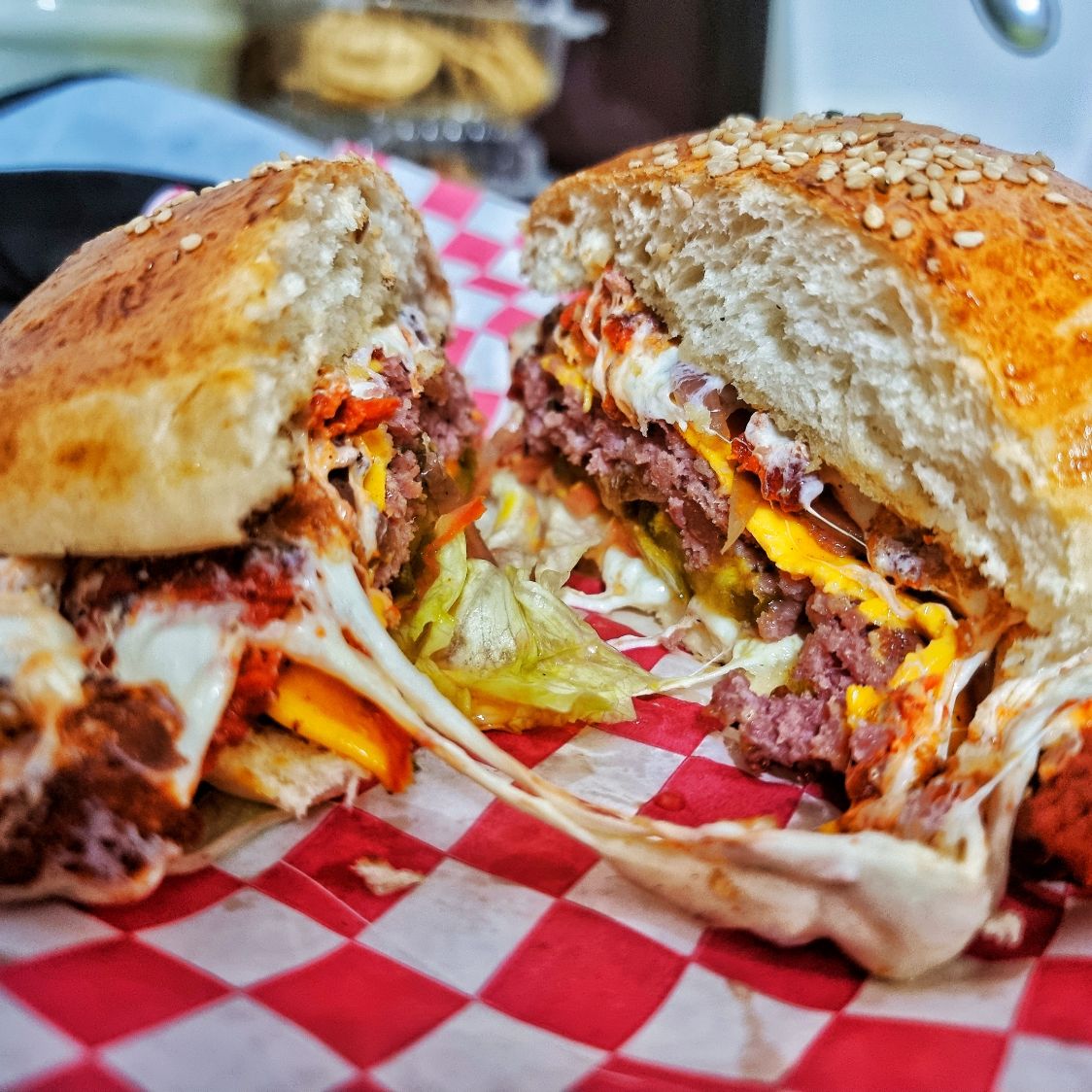 BOLLO CASERO,DOS MEDALLONES DE CARNE DE 125 GRS C/U, QUESO ASADERO EN LA BASE, LECHUGA, JITOMATE, PEPINILLOS, CHILE JALAPEÑO , QUESO TIPO AMERICANO, CEBOLLITA CARAMELIZADA. ACOMPAÑADA CON 100 GRS DE PAPA A LA FRANCESA