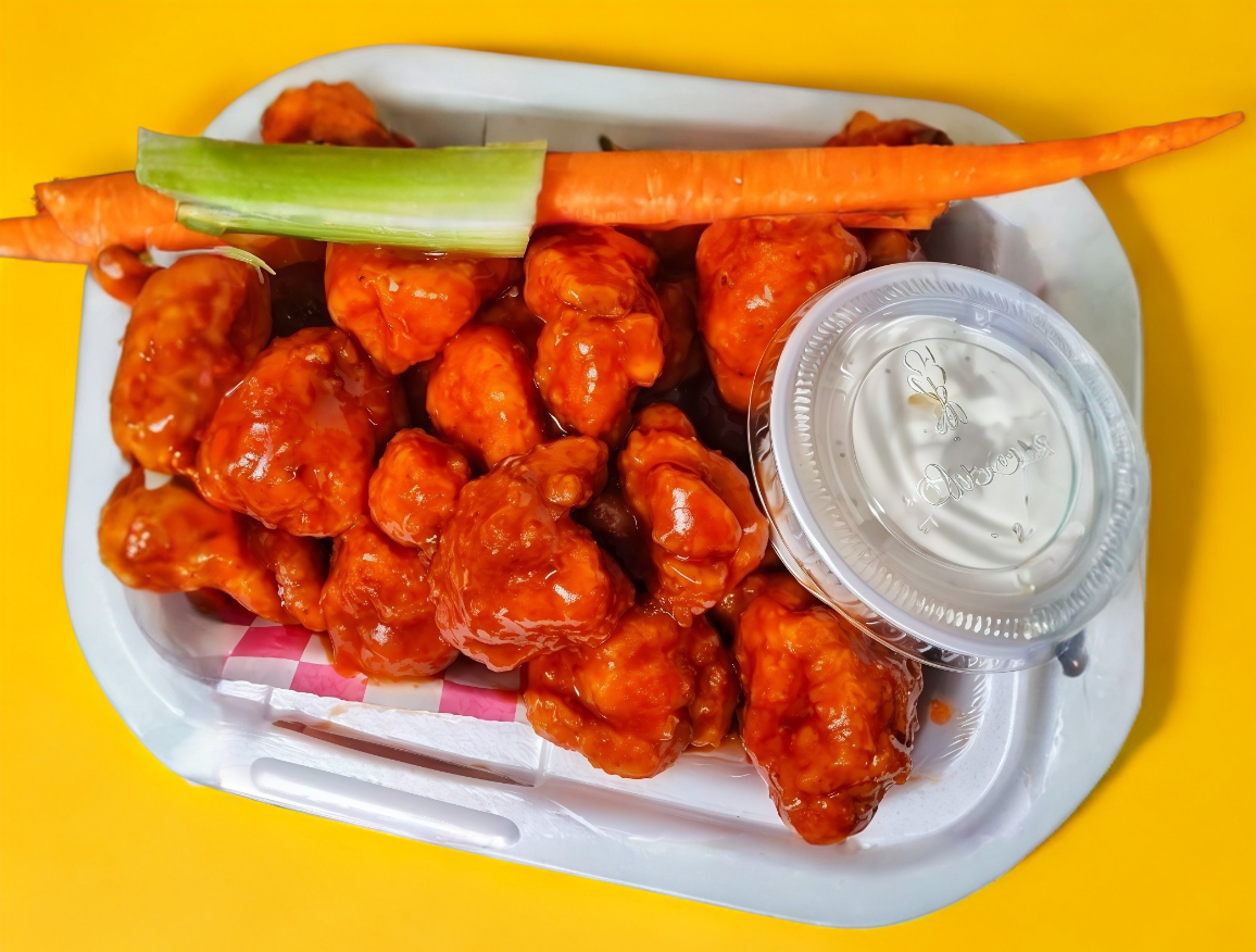 Boneless 150 gr, puedes elegir una salsa, acompañados de aderezo ranch. Pesados en crudo.