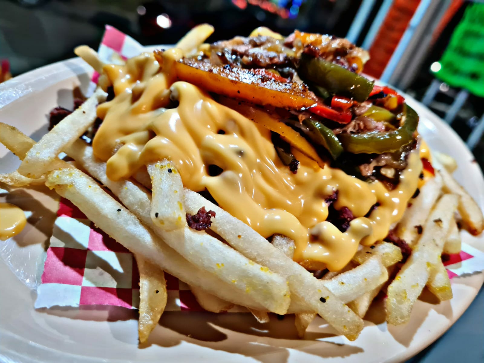 BOLLO CASERO, MEDALLON DE CARNE DE 125 GRS C/U, QUESO ASADERO EN LA BASE, LECHUGA, JITOMATE, PEPINILLOS, CHILE JALAPEÑO , QUESO TIPO AMERICANO, CEBOLLITA CARAMELIZADA, 150 GRS DE FAJITAS DE ARRACHERA. ACOMPAÑADA CON 100 GRS DE PAPA A LA FRANCESA
