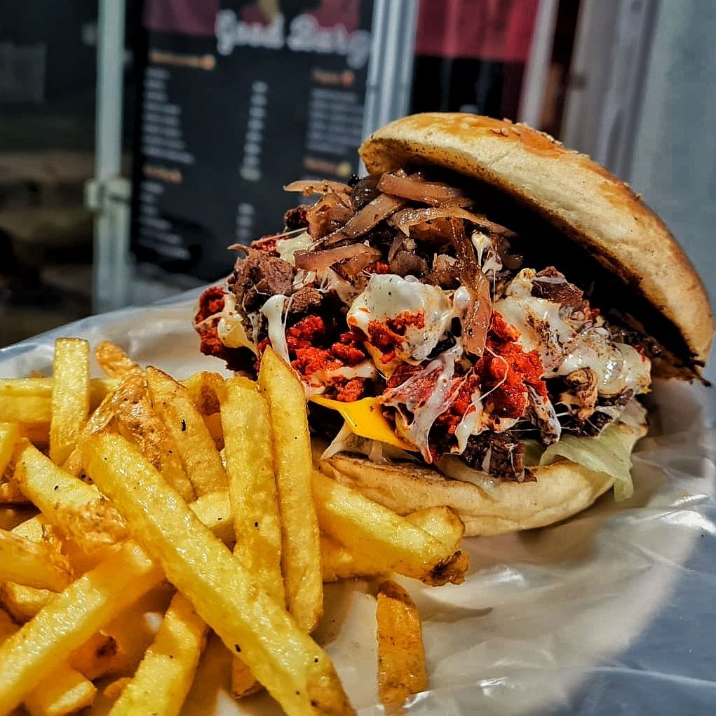 BOLLO CASERO, MEDALLON DE CARNE DE 125 GRS C/U, QUESO ASADERO EN LA BASE, LECHUGA, JITOMATE, PEPINILLOS, CHILE JALAPEÑO , QUESO TIPO AMERICANO, CEBOLLITA CARAMELIZADA, 150 GRS DE CHORIZO CON QUESO GRATINADO Y FAJITAS DE RICA ARRACHERA. ACOMPAÑADA CON 100 GRS DE PAPA A LA FRANCESA