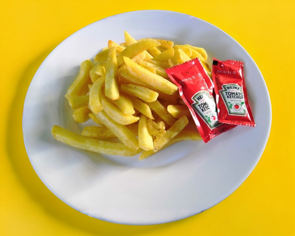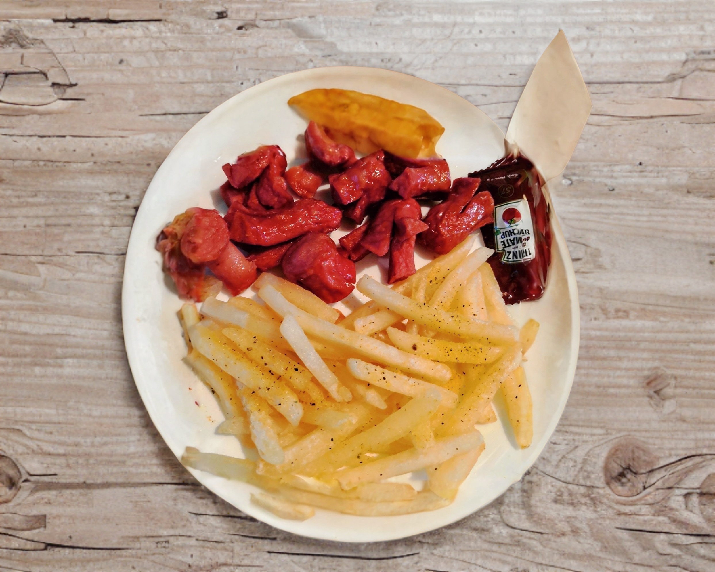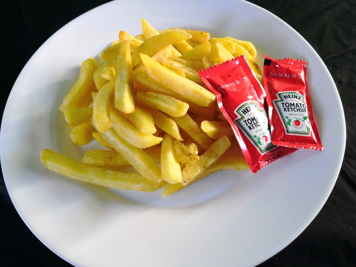 Salchicha frita acompañada de papa francesa.