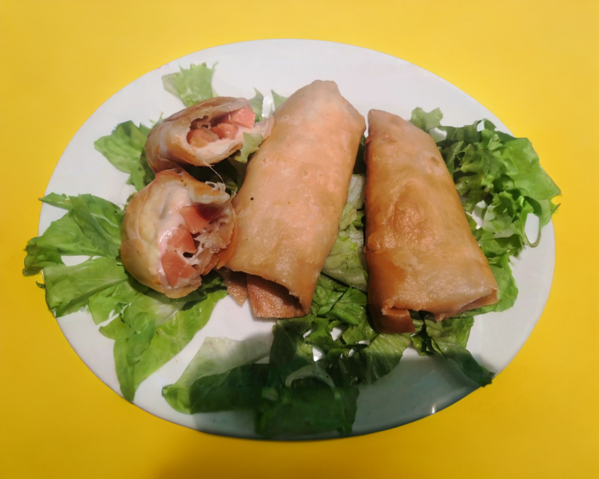 Tortilla de harina envuelta, rellena de queso mozarella y salchicha.