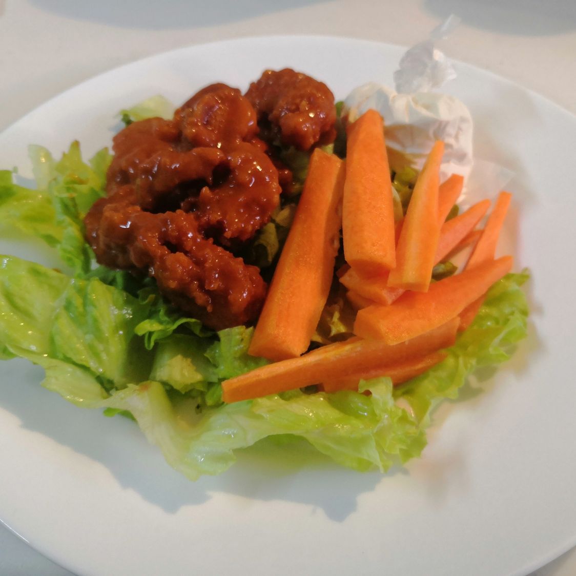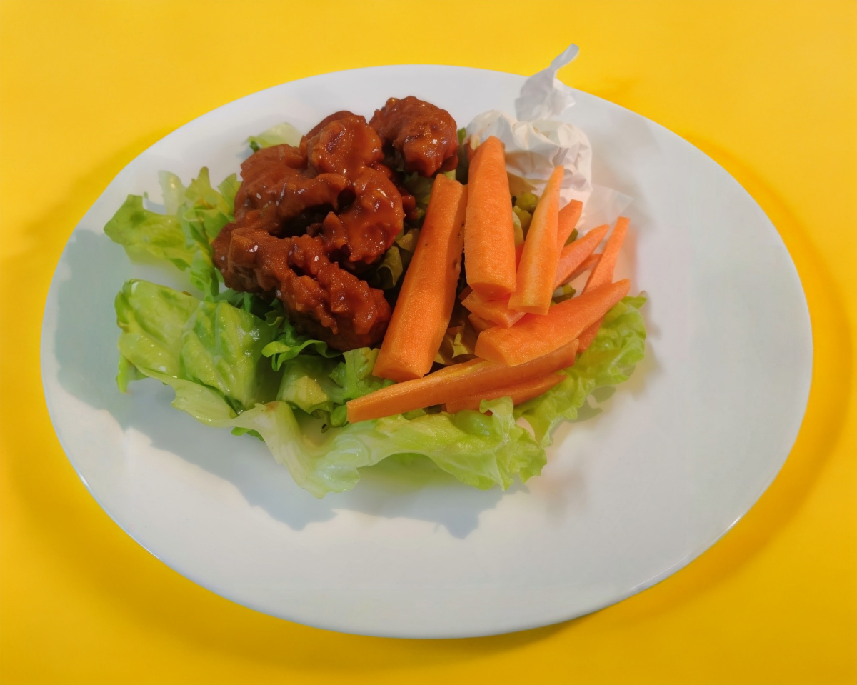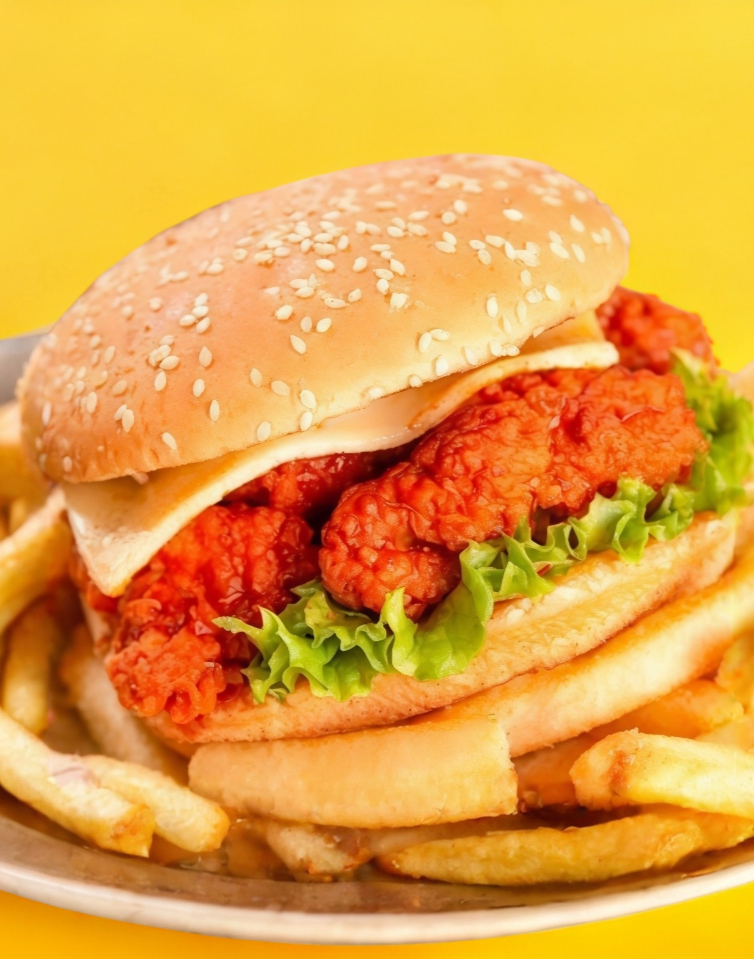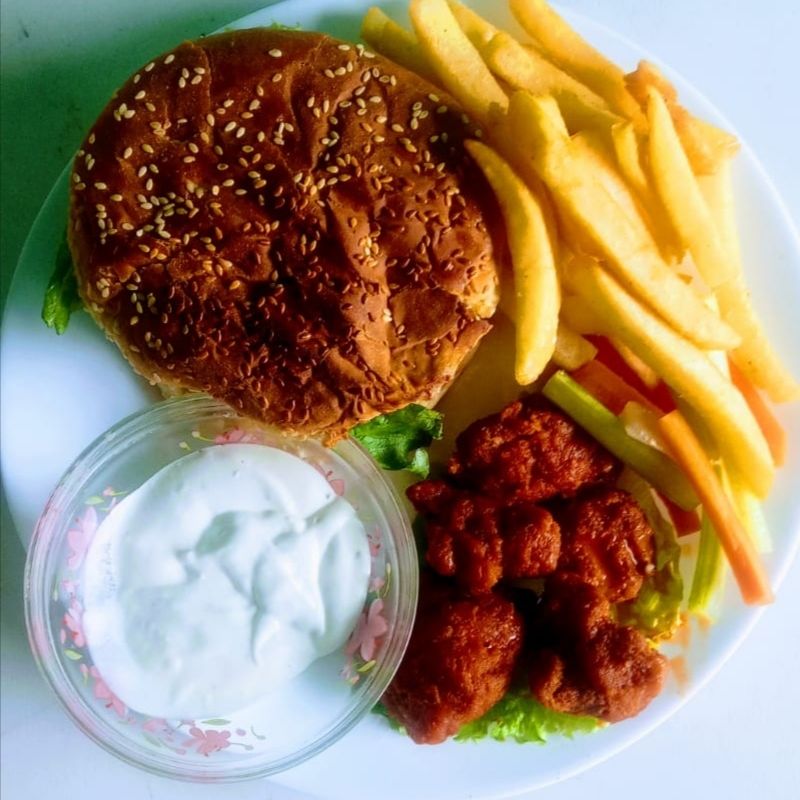 Hamburguesa de boneless bañados en la salsa de su elección, acompañada de papas ala francesa