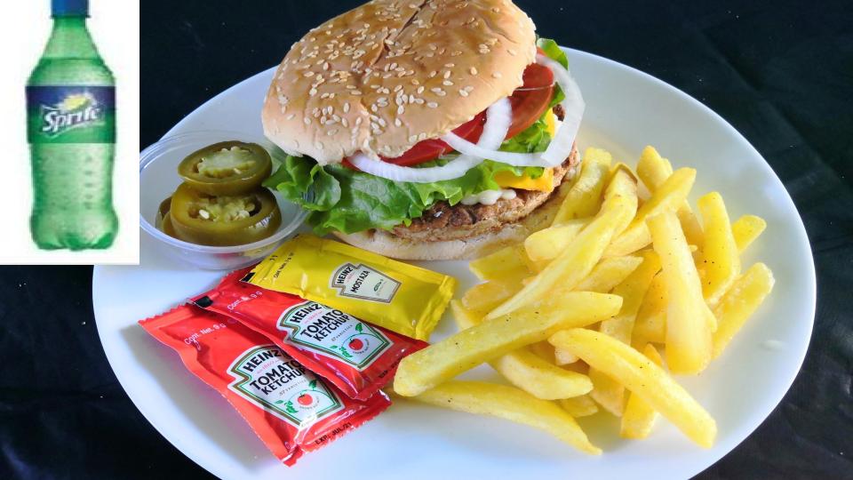 Hamburguesa con papas y bebida delata