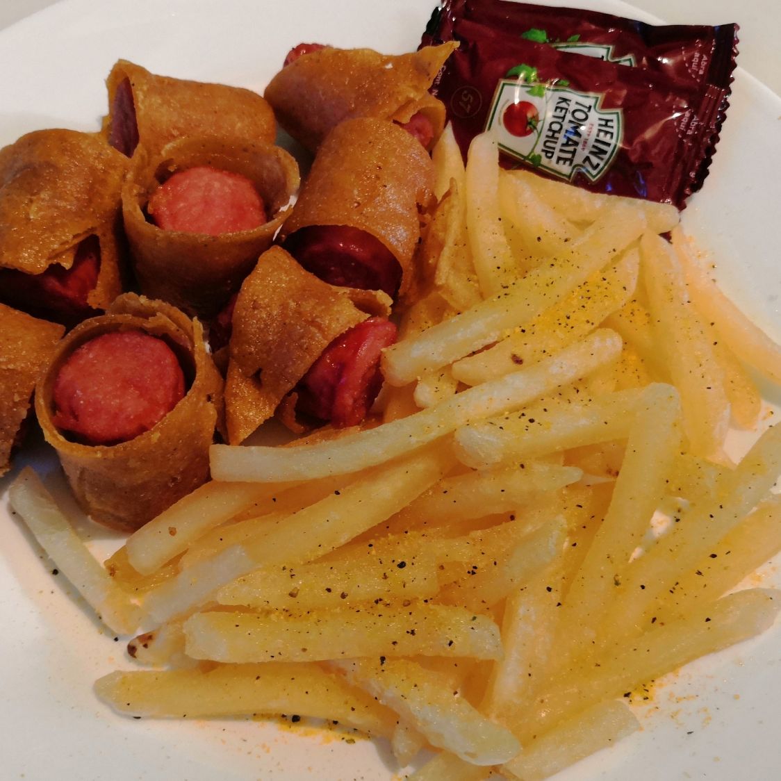 Salchicha envuelta en tortilla de maíz fritas acompañada de papa francesa.