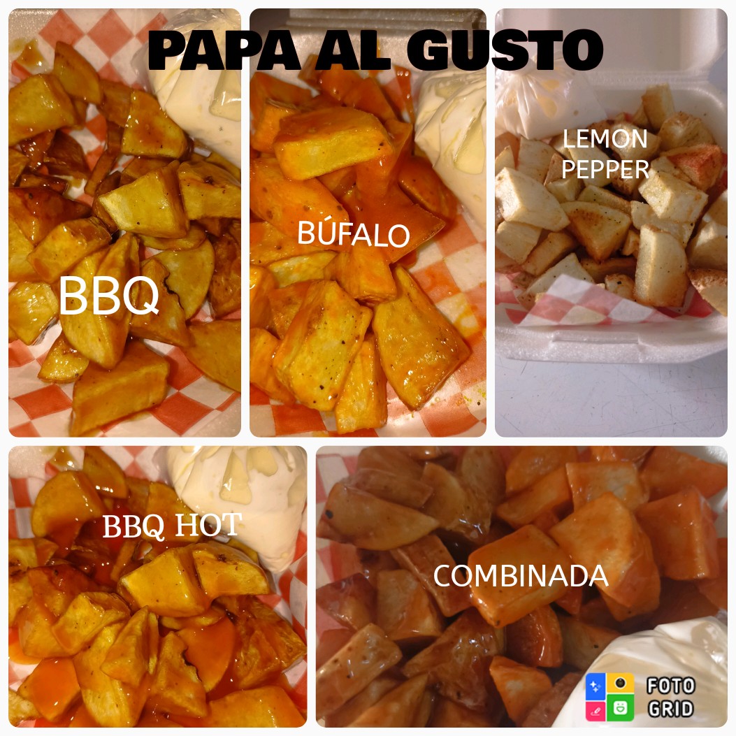 Papa bañada a tu gusto, salchipulpos, salchitacos, papa francesa.
