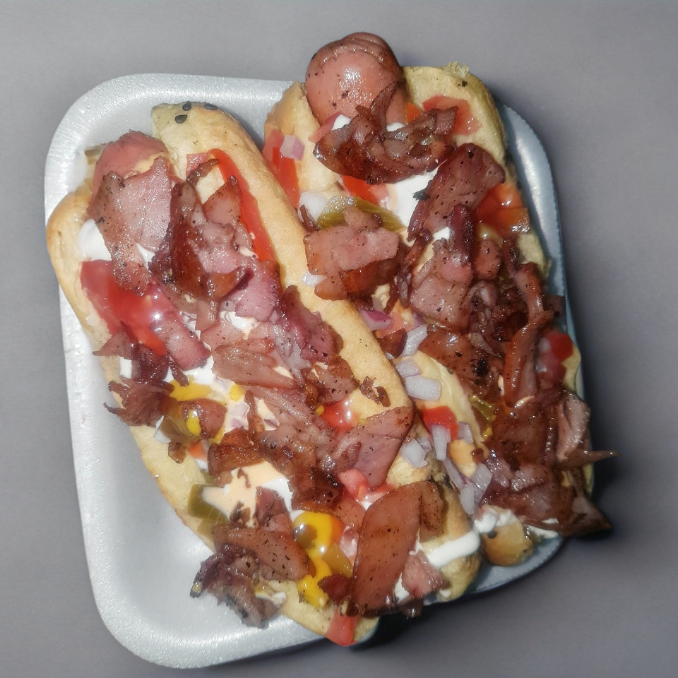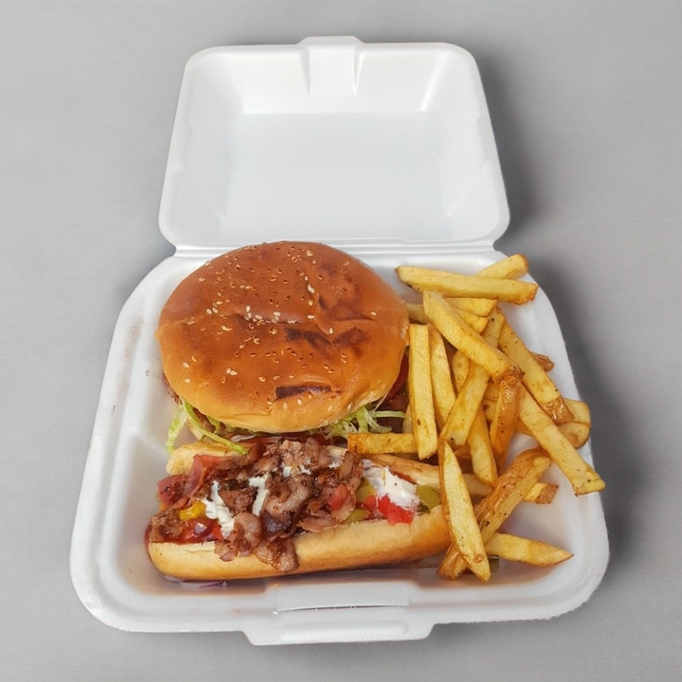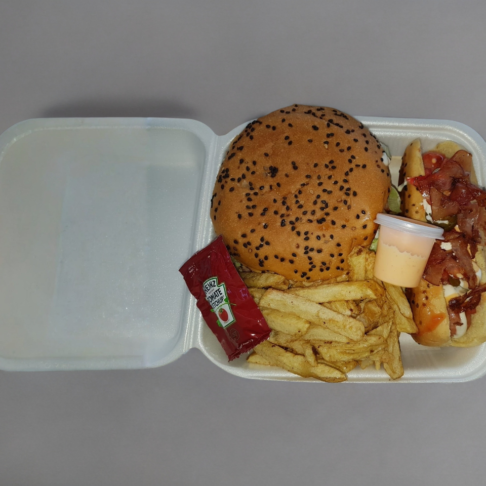 Incluye 1 Hamburguesa clásica de 125g aprox con Verdura fresca (Jitomate, Lechuga, Cebolla), Chile jalapeño, Aderezos (Mayonesa, Cátsup, Salsa chimichurri) y Una porción individual de papas a la francesa Adicional viene 1 Hot dog clásico con Salchicha envuelta en tocino, Jitomate, Chile Jalapeño, Cebolla asada y Cátsup. (NO incluye bebida).