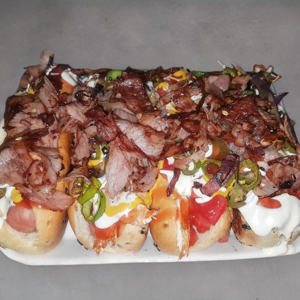 Salchicha, verdura y aderezos. Queso asadero y chiles toreados.