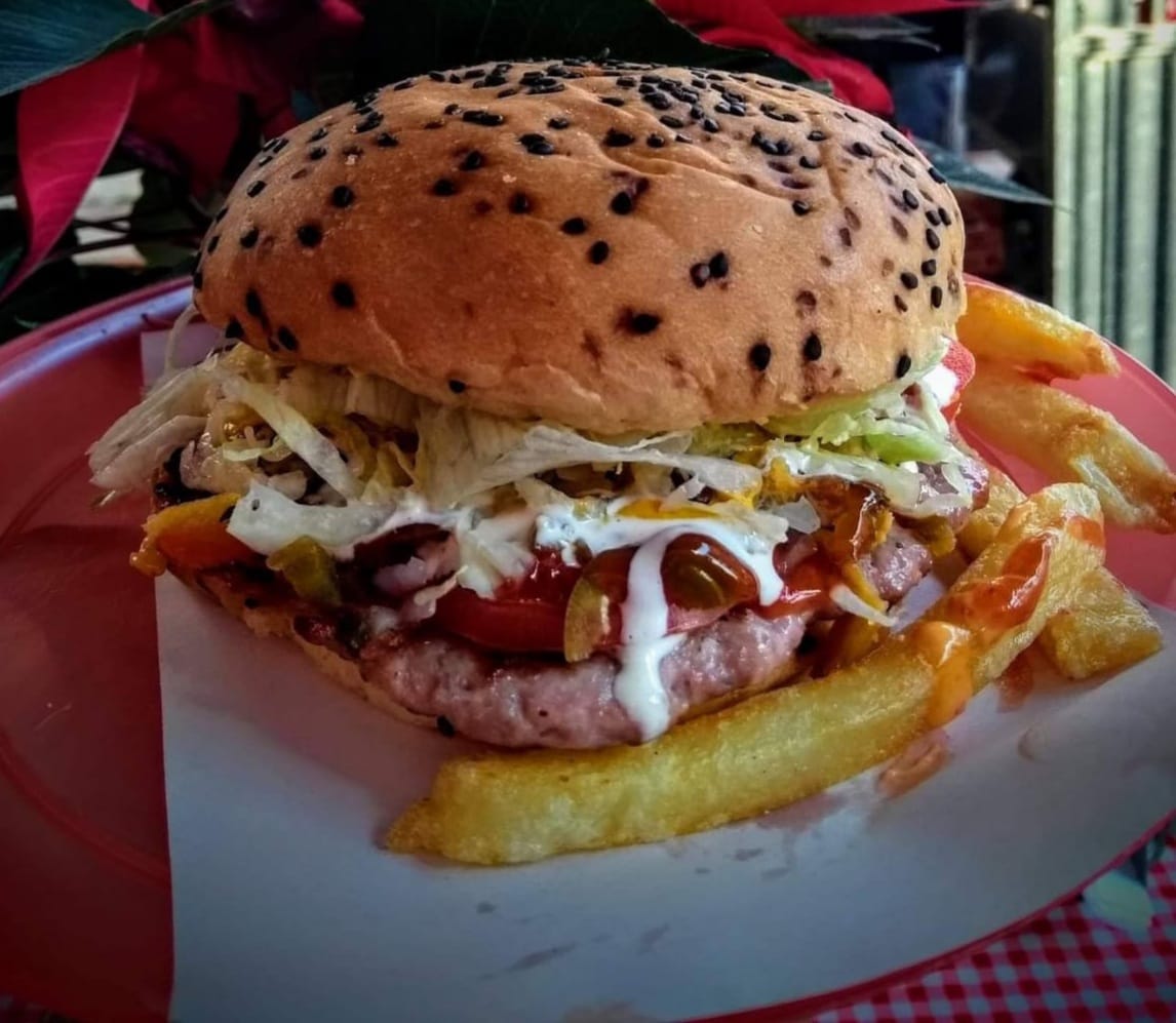 Carne res 125gr, lechuga, jitomate, cebolla, jalapeño, queso manchego, mayonesa, cátsup y mostaza.