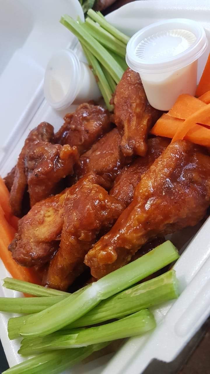 Búfalo, BBQ, mango habanero, acompañado de apio, zanahoria y ranch.