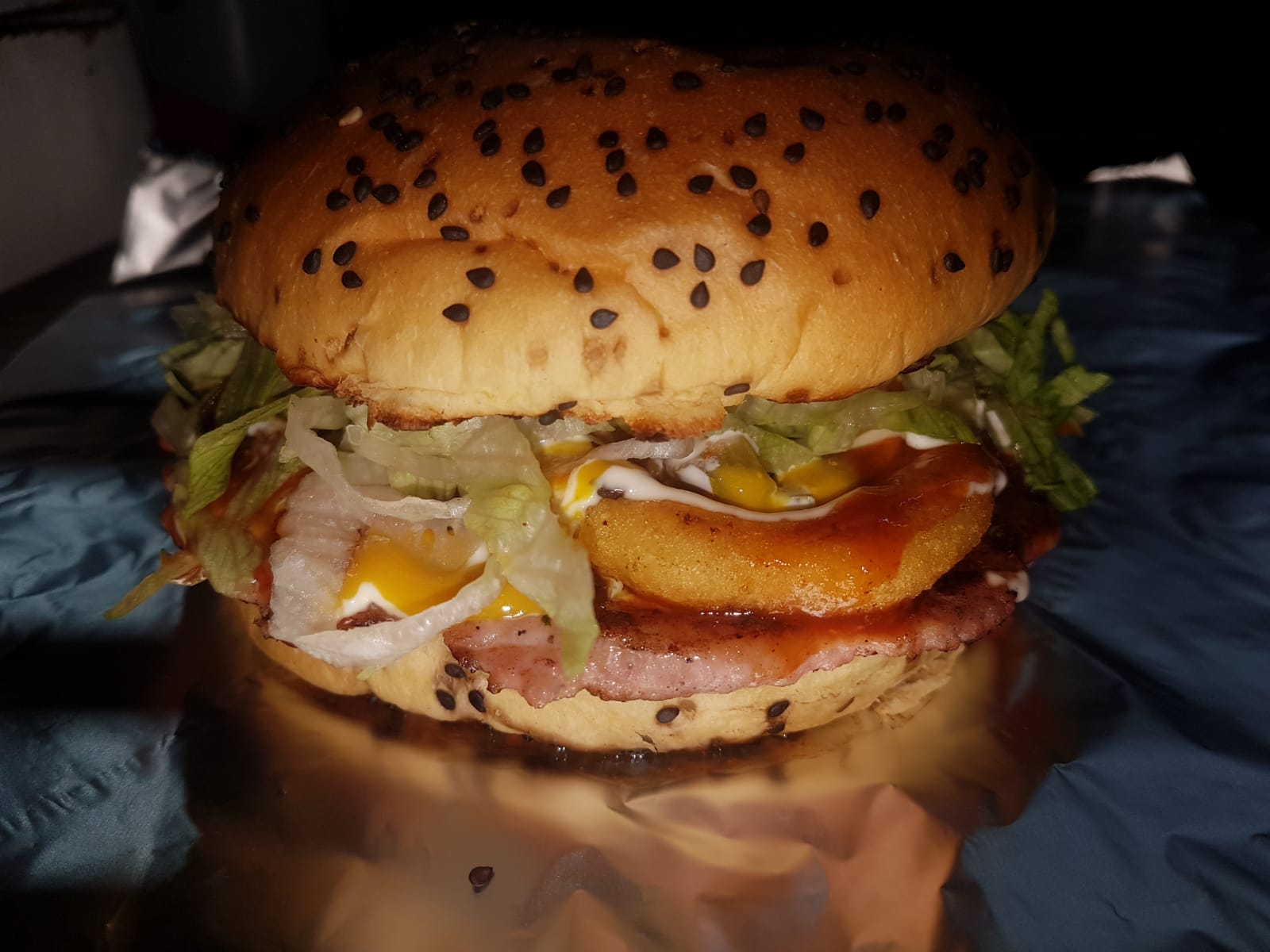 Carne res 125grs, lechuga, BBQ, aros de cebolla, queso manchego, jitomate, cebolla, jalapeño, mayonesa, cátsup, mostaza.