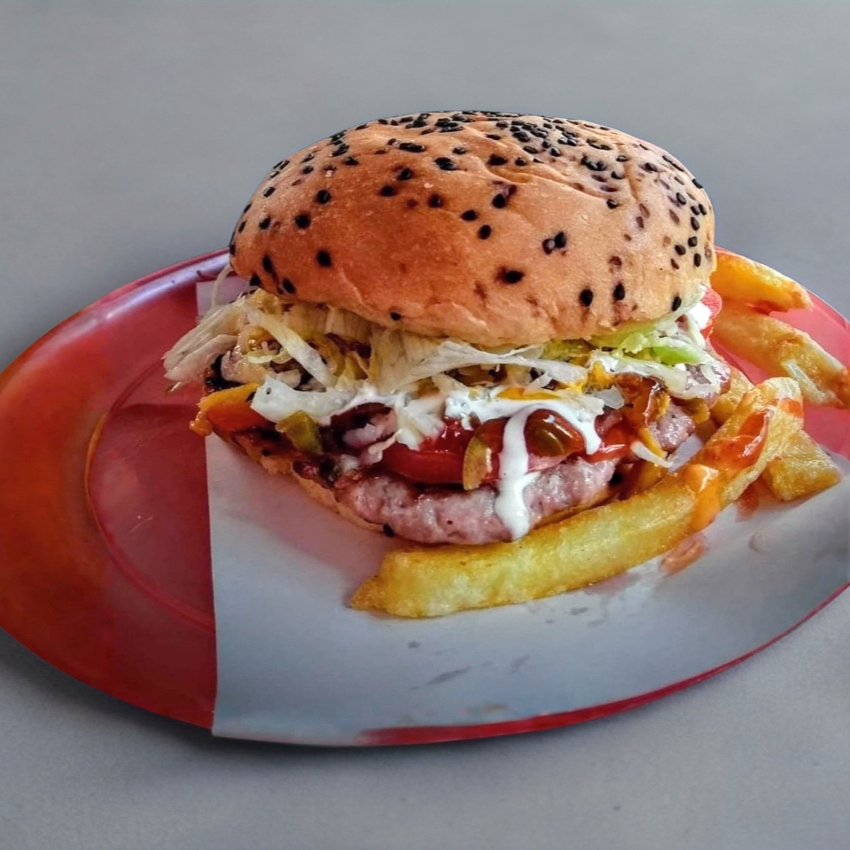 Carne res 250grs, lechuga, jitomate, cebolla, jalapeño, queso manchego, mayonesa, cátsup, mostaza.