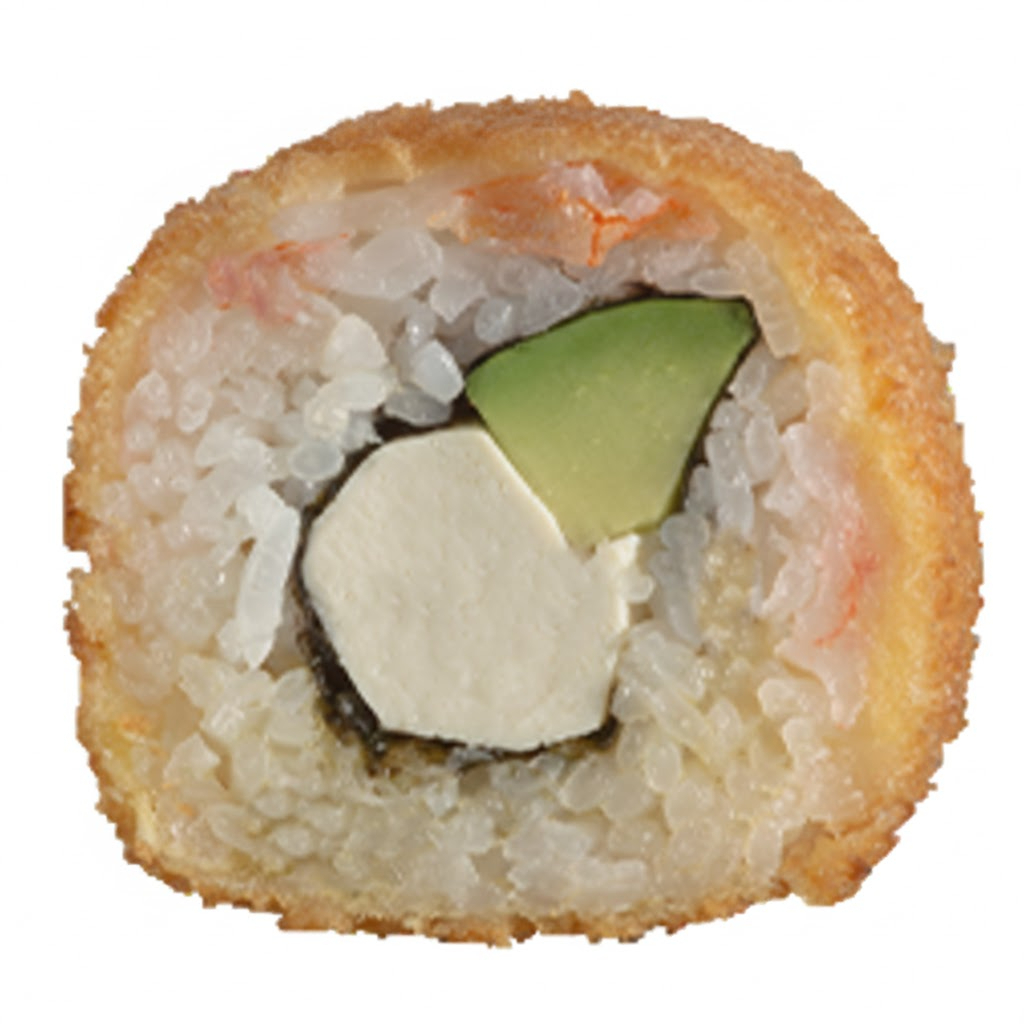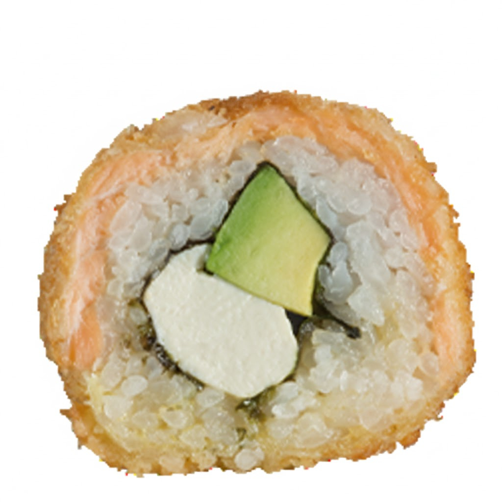 Queso crema, pepino y aguacate en su interior cubierto de salmón empanizado (servido con salsa Tampico y salsa anguila).
