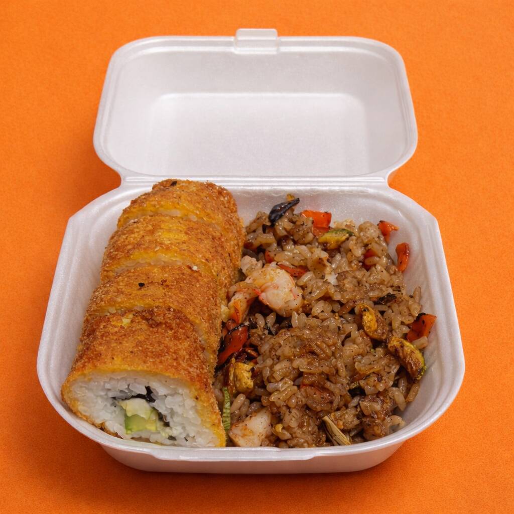 Arroz frito de verduras y 5 pzas de sushi empanizado vegetariano