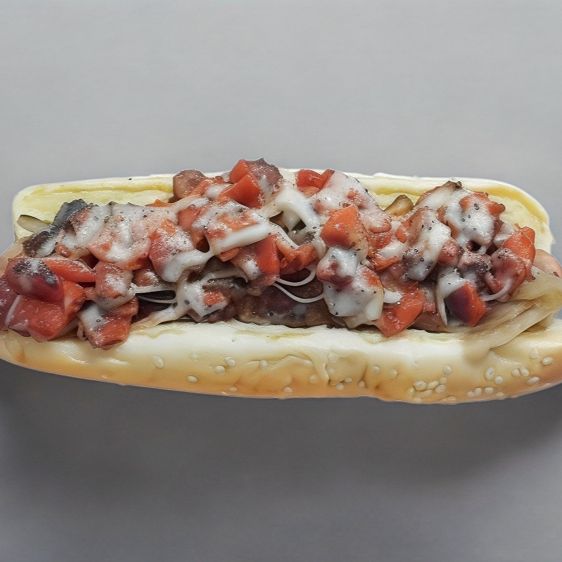Pan Jumbo salchicha chorizo queso asadero cebolla asada jitomate chile mayonesa catsup y mostaza.