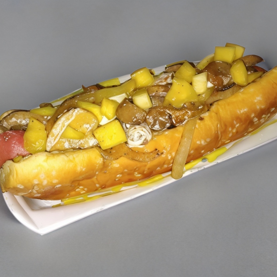 Pan Jumbo, Salchicha, queso asadero, champiñones con piña asada, jitomate, cebolla asada, mayonesa, catsup y chimichurri