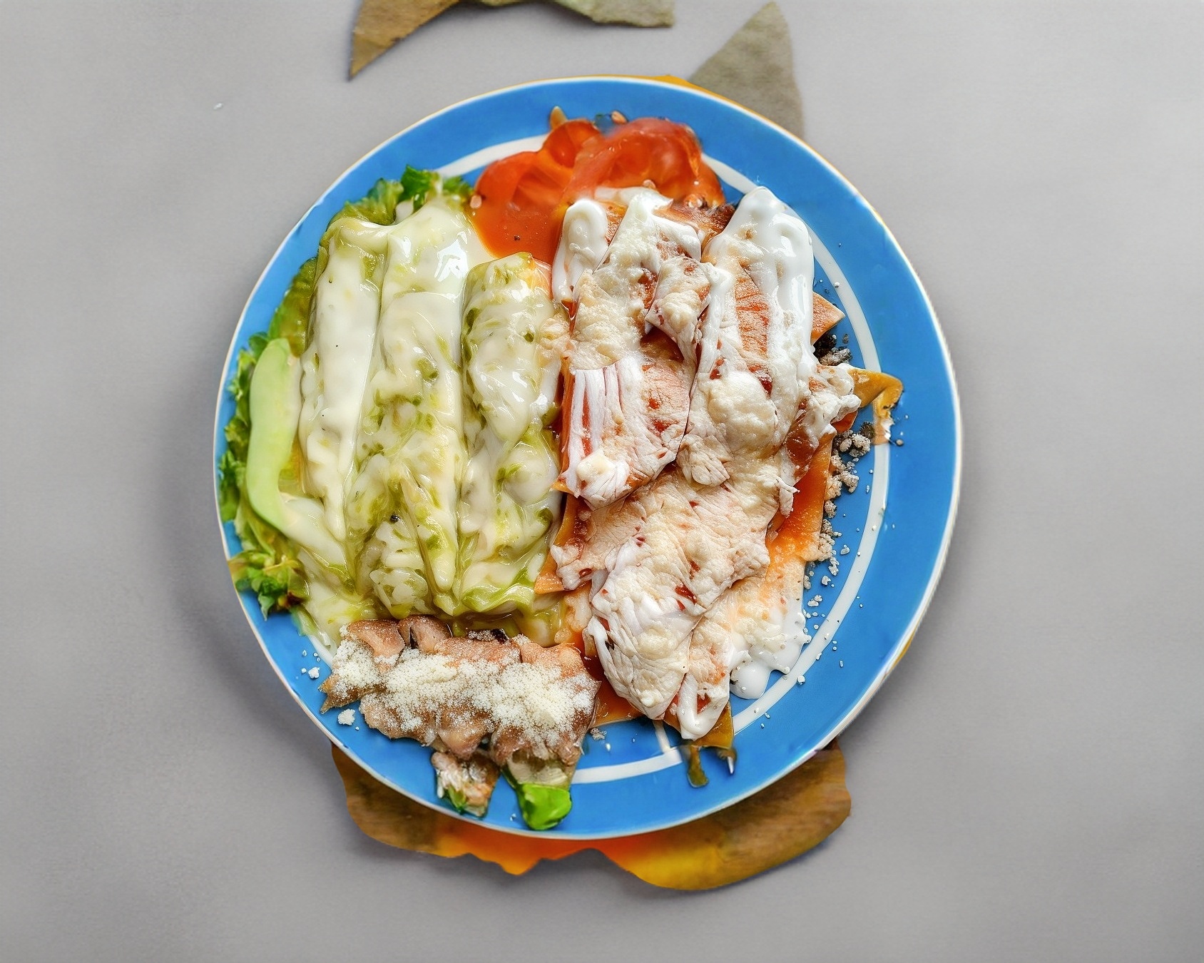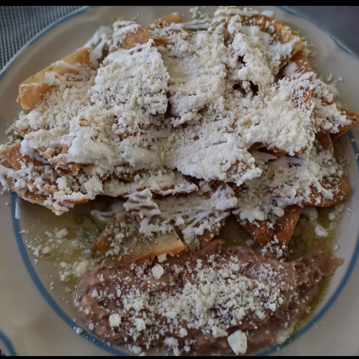 Tortillas troceadas y fritas, cubiertas con salsas, acompañadas de pollo y crema con salsa roja o verde acompañado de frijoles y rebanadas de pan.