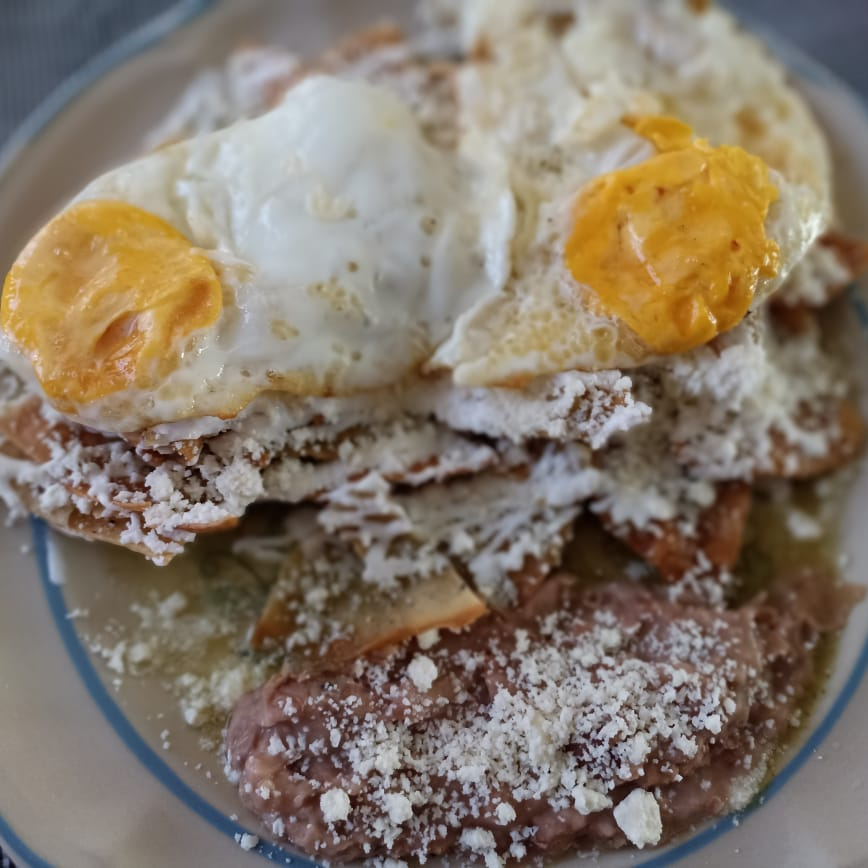 Tortillas troceadas y fritas, cubiertas con salsas, acompañadas de huevos estrellados, crema, queso y frijoles refritos.